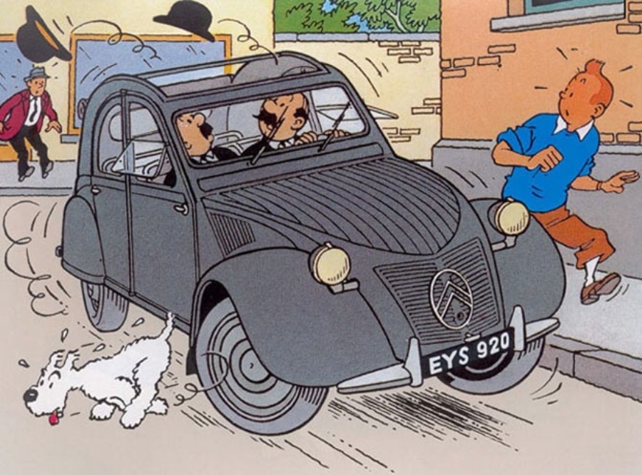 La serie gráfica de 'Las aventuras de Tintin', de Hergé, cuenta con una gran presencia por parte del automóvil en sus tomos. Hergé era un entusiasta de los coches y, fruto de su pasión, se han realizado exposiciones temáticas o incluso rallies con los clásicos que han aparecido en sus viñetas. La presencia del Citroën 2 CV en Tintin es una constante, en especial en 'El asunto Tornasol' y su posterior réplica en la serie de animación de Tintin basada en sus tebeos. Como curiosidad, Hergé acabó dibujando una campaña publicitaria para la firma francesa.