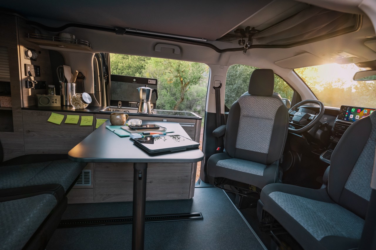 El interior es funcional y práctico. La mesa puede utilizarse para comer, trabajar o jugar a las cartas y también se puede plegar para maximizar el espacio a bordo cuando sea necesario. La camper de Citroën dispone de numerosos espacios de almacenamiento para mantener el habitáculo ordenado, así como un depósito de diez litros para el agua limpia y otro del mismo tamaño para las aguas residuales. Opcionalmente, puede ofrecer una ducha en la parte trasera del vehículo, combinada con un depósito de 25 litros y un inodoro extraíble.