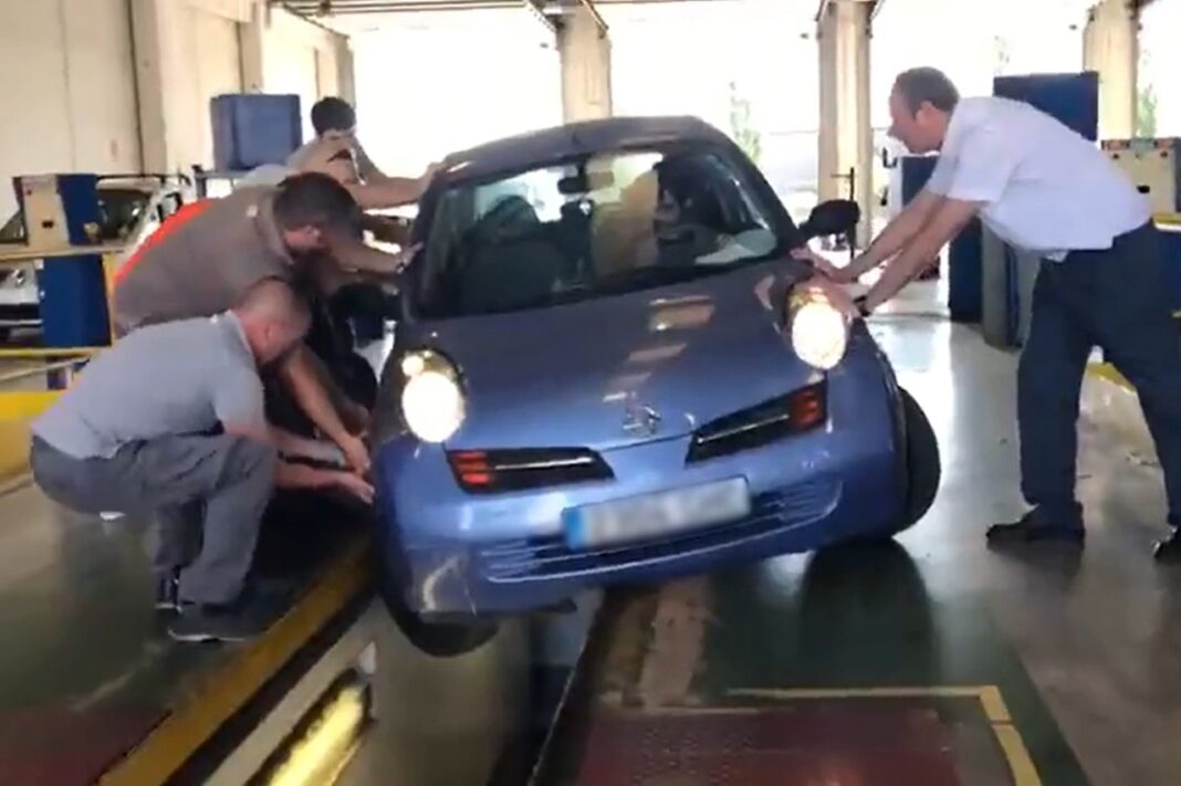 Finalmente, el dueño del Micra no atinó bien y terminó con la rueda delantera derecha en el foso. Inmediatamente, acuden varios técnicos a ayudarlo. Aunque no es un vehículo pesado, sorprende la maniobra que llevan a cabo para sacar el coche del foso, bamboleándolo sin ser capaces de sacarlo. Desconocemos si, finalmente, el coche pasó la ITV o no, pero está claro que tendrá que hacer una visita al taller para revisar los bajos.