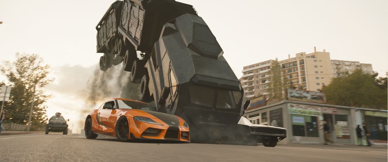En otra de las escenas de acción con coches que hemos podido ver en el segundo tráiler de A todo gas 9, descubrimos un Toyota GR Supra (prueba) de color naranja. A los mandos del deportivo japonés irán Han y Mia (¿guiño al Supra original de la primera película?). Junto al Charger de Toretto, tratan de derribar un camión blindado llamado Armadillo.