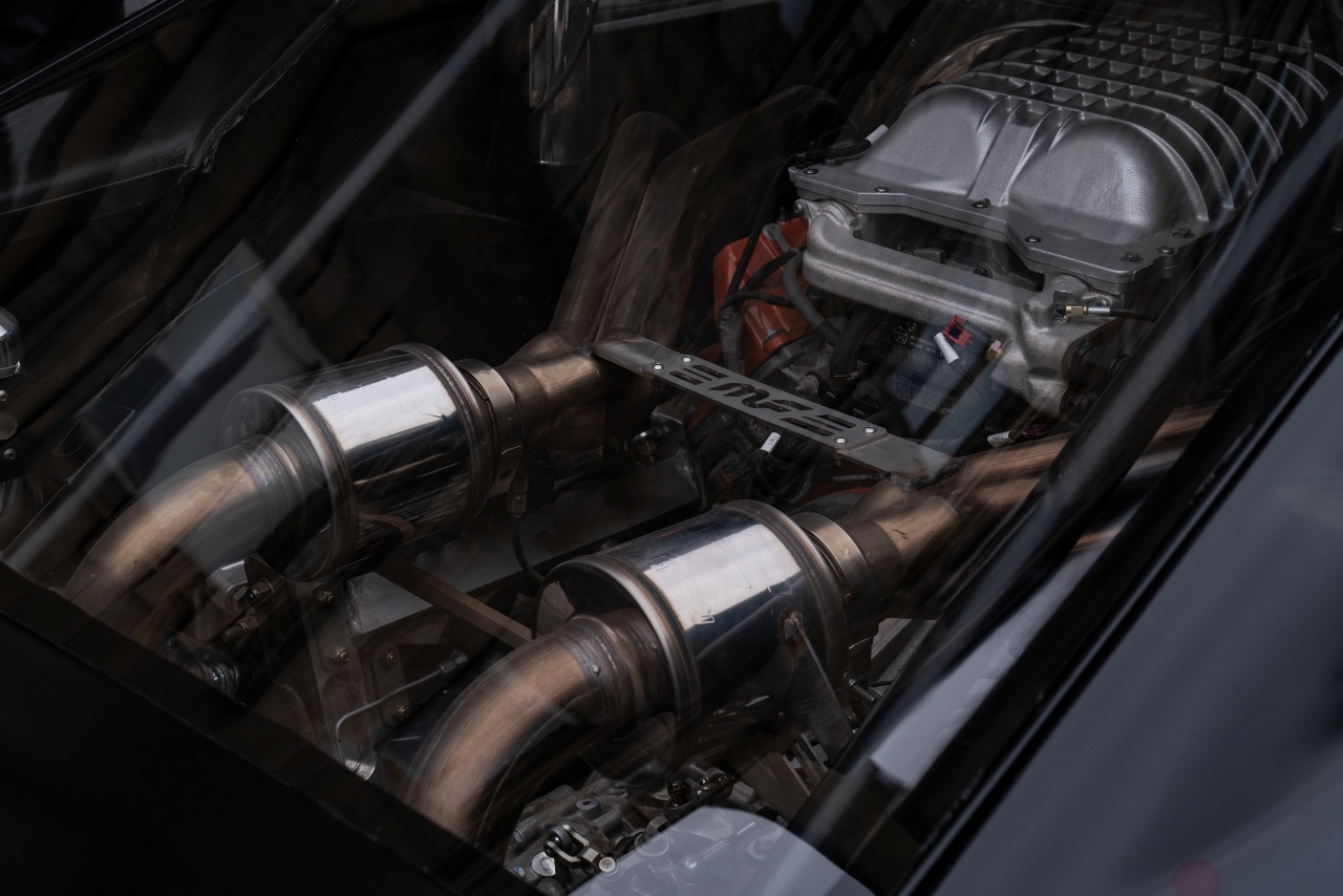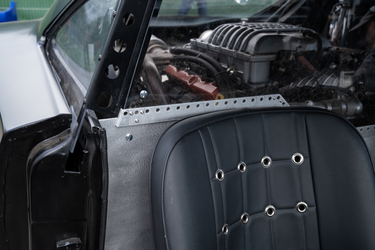 Esto se debe a que el motor no estará ubicado en la parte delantera, sino más bien detrás de los asientos, en posición central. Se trata de un V8 de la vieja escuela separado de la cabina por una pantalla de plexiglás. Delante, una pareja de asientos de tipo cubo. Desde el exterior de este descomunal Charger se puede ver el motor y el sistema de escape a través de las ventanas.
