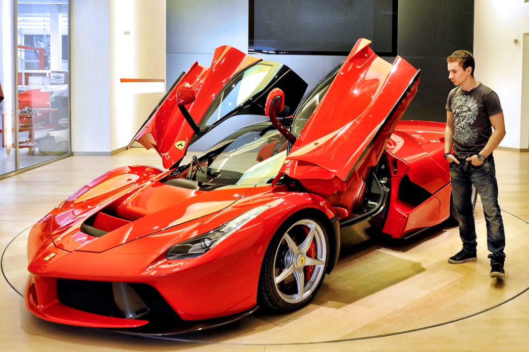 Jorge Lorenzo mirando uno de sus coches: el Ferrari LaFerrari