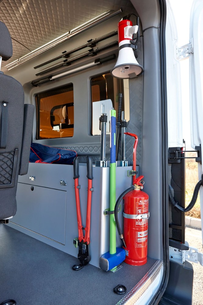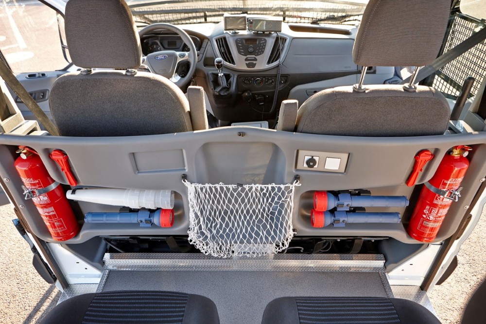 El Ford Transit es el vehículo utilizado por los Mossos para el traslado de detenidos. El vehículo se diferencia en dos secciones: el habitáculo de conducción, donde encontramos un sistema eléctrico Bersee que gestiona y controla el equipamiento eléctrico y permite el cierre de celdas o el funcionamiento de los cinturones de seguridad; mientras que el área de traslado de detenidos presenta varias celdas aisladas equipadas con asientos ergonómicos y diseñados para evitar autolesiones, al mismo tiempo que el suelo está blindado, dispone de desagüe y se limpia con facilidad.