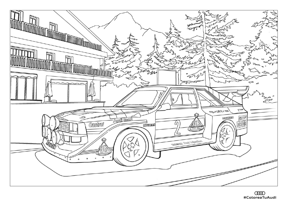 El primero de los modelos de Audi que puedes colorear en estas ilustraciones oficiales y gratuitas es el Audi quattro S1, la versión de competición del Audi Sport quattro (prueba) que forjó su leyenda en los rallyes a mediados de la década de los años 80 y puso en el mapa la legendaria tracción quattro de la compañía, que este año celebra su 40º aniversario.