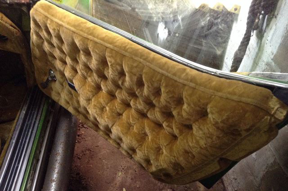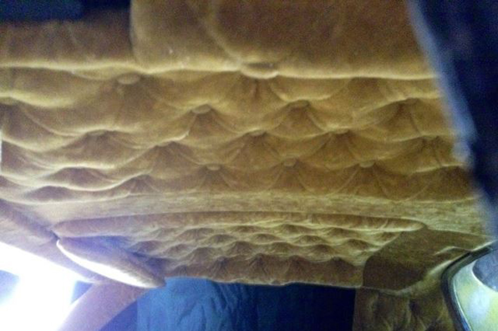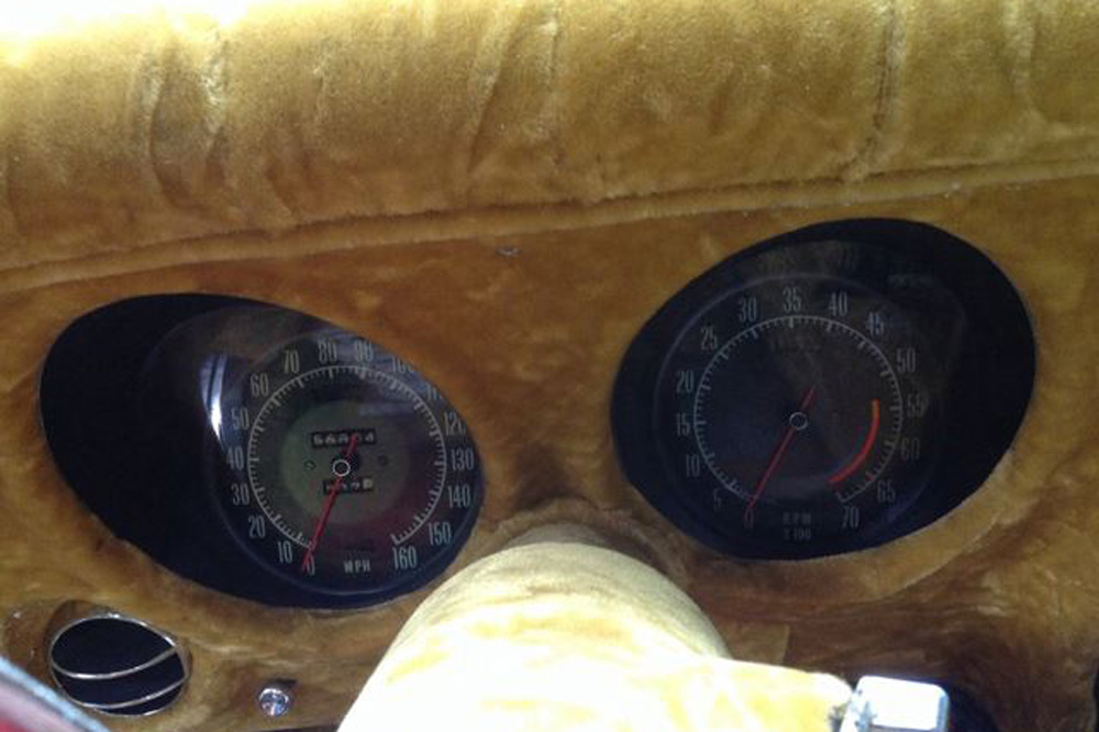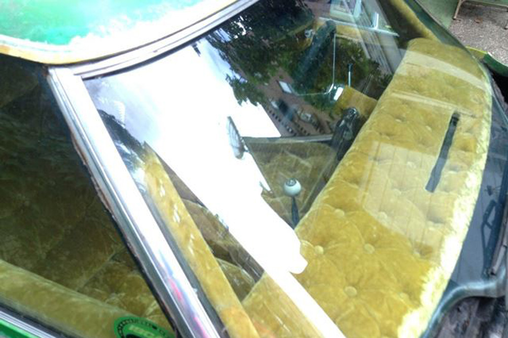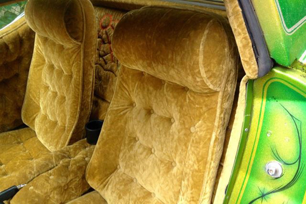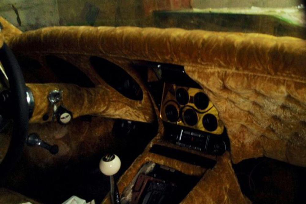 Sí, está completamente cubierto por terciopelo dorado (¿sería el coche de una estrella del porno?). Y cuando decimos completamente, nos referimos a TODO el interior, desde la columna de dirección, el salpicadero o el piso, hasta el techo. Estaba anunciado en eBay, pero el vendedor ha decidido retirarlo. Natural, seguro que pocas personas estarían dispuestas a desembolsar los 10.000 dólares que pedía por este engendro con ruedas.