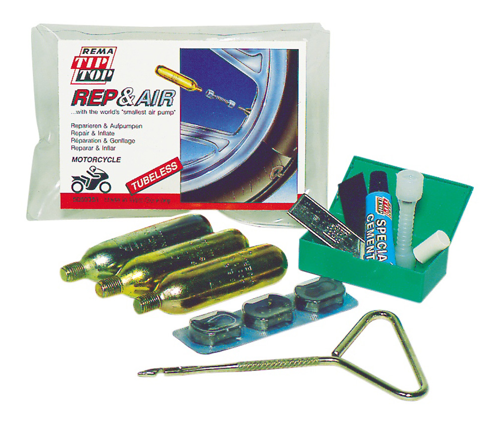 Todos los automóviles modernos montan ruedas sin cámara, si bien, todavía es posible encontrar motocicletas que lleven cámara, si es tu caso debes saber que la forma de proceder para arreglar un pinchazo es diferente. Además de los más modernos kits de reparación de pinchazos que emplean un líquido sellante, también podrías utilizar un kit de reparación tradicional (en la imagen superior), que habitualmente incluye unos alicates -para sacar el posible objeto punzante-, una pequeña lima -para suavizar las formas del agujero-, un ‘gusano’ o mecha de caucho -que será lo que tapone el boquete-, un punzón que te permita introducir ese pedacito de caucho en el punto por donde sale el aire, un pegamento especial, una cuchilla para eliminar los restos de pegamento y una bombona que te permitirá volver a hinchar el neumático.