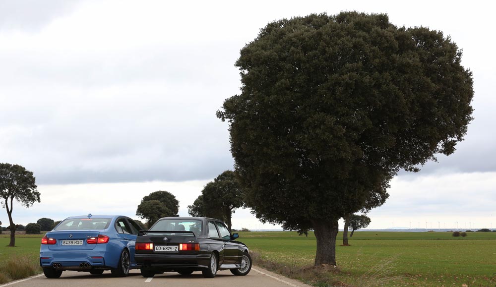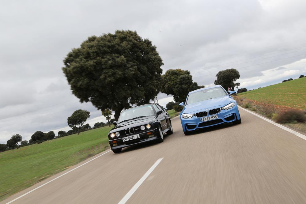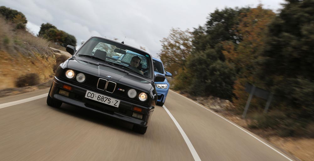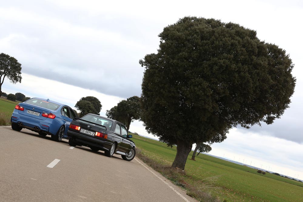 Diversión tampoco falta al M3 F80 porque con él puedes ir realmente rápido, pero tienes que tener mucho tiento con el pedal del gas. La zaga puede pegarte algún susto debido al torrente de potencia de su seis cilindros, que hace que incluso en tercera velocidad salten los controles para corregir la posición del vehículo. Además, carece de esa agilidad que tiene el E30, algo lógico, solo tienes que echar un vistazo a la ficha técnica para ver el abismo existente de más de 400 kilogramos.