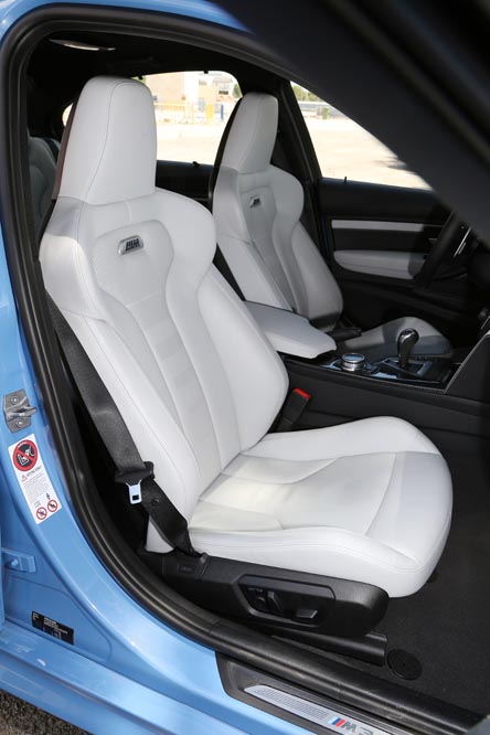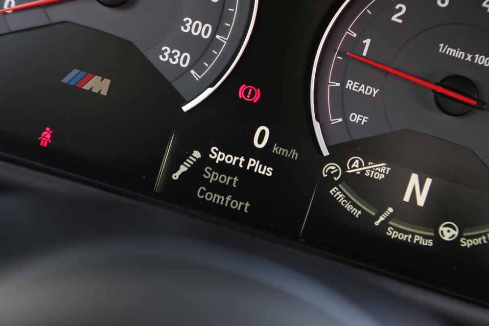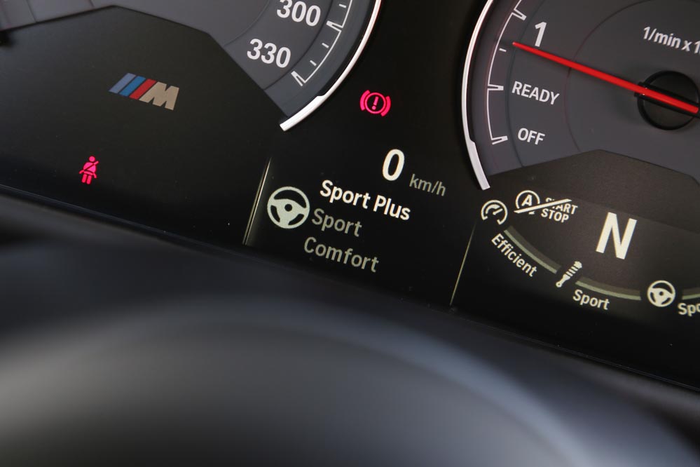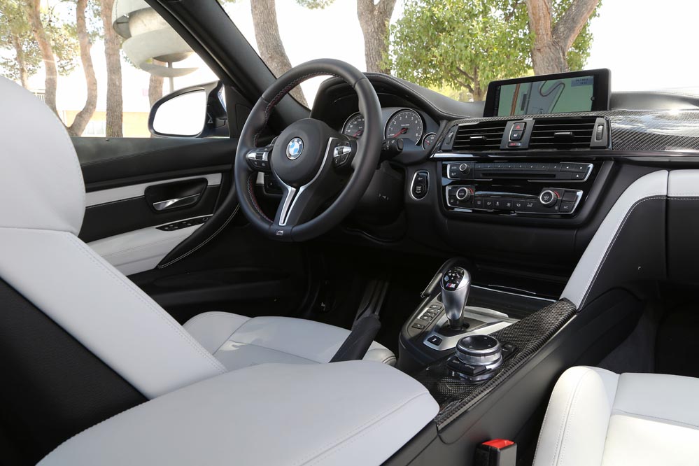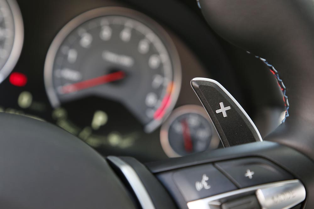 En marcha, mi mano derecha ‘juega’ con la caja Getrag 265/5 de 5 velocidades del M3 E30, con la primera hacia atrás y el resto formando la clásica H. Es muy precisa, tiene un tacto especial, duro y sientes todos los engranajes a través de la corta palanca. Es bastante rápida, pero nada tiene que hacer con el vertiginoso cambio de doble embrague del F80, que monta la tercera generación de la caja M DKG. Ya sea de forma automática o manual gracias a las levas de tipo galvanizado situadas tras el volante, las transiciones entre marchas se realizan de forma vertiginosa, sin interrumpir la transmisión de la fuerza de tracción, aunque en algunos casos, dependiendo del modo de conducción escogido, son demasiado bruscas. Además de reducir el consumo, esta transmisión con Drivelogic ofrece la función ‘Launch Control’, con la que la capacidad de aceleración es óptima desde parado, algo impensable hace treinta años.