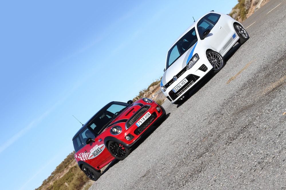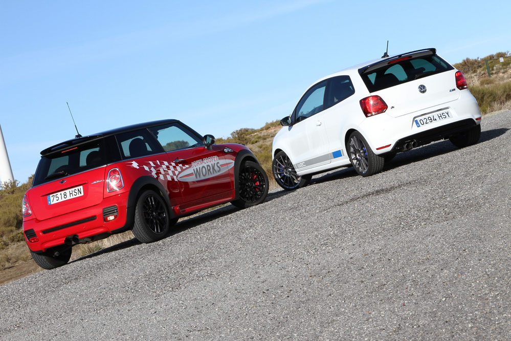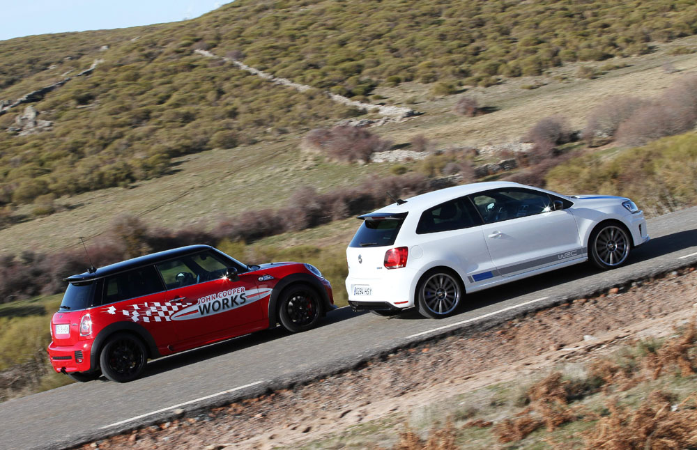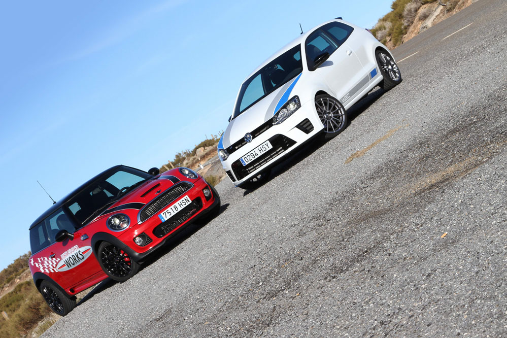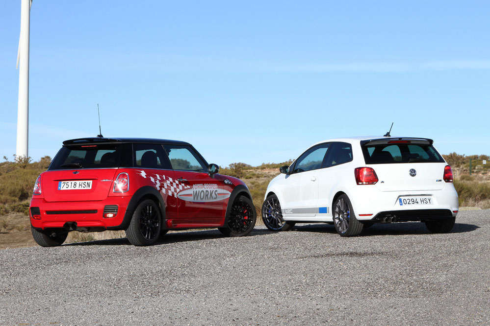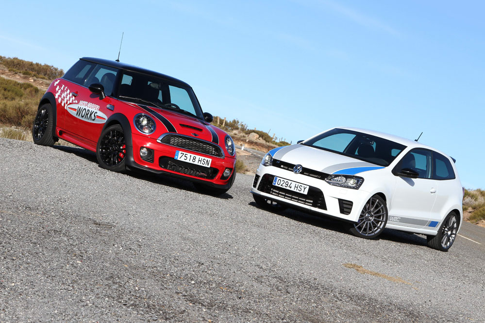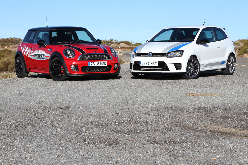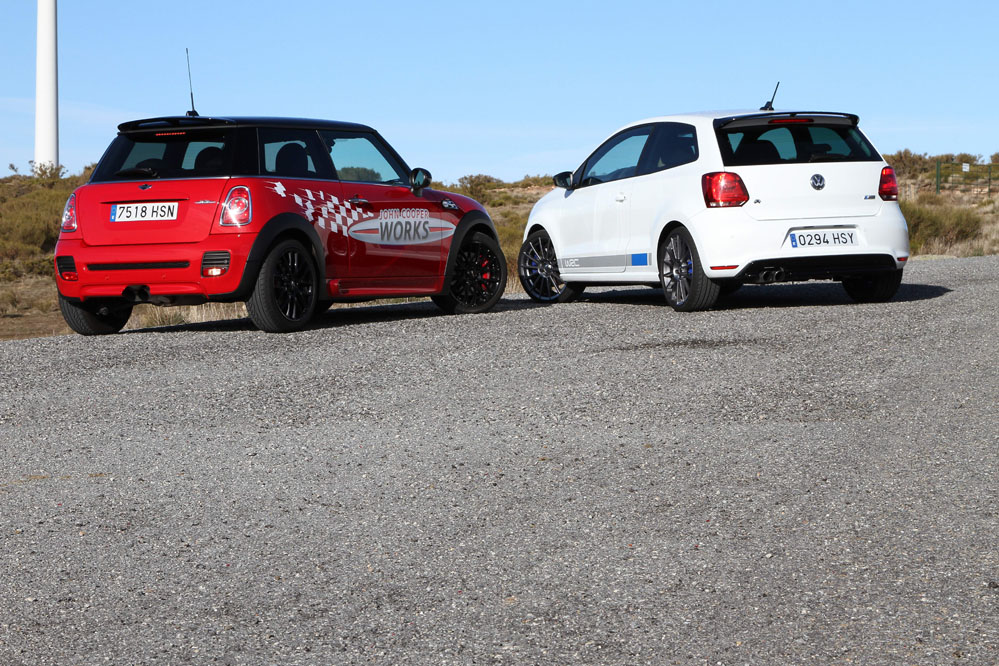 Hoy enfrentamos a dos auténticos cohetes de bolsillo, dos coches que bajo sus relativamente pequeñas carrocerías esconden potentes motores turboalimentados capaces de superar los 200 CV con margen. Son rápidos, divertidos, exclusivos, prácticos y caros, muy caros. Ya los hemos probado por separado (prueba Volkswagen Polo WRC R y prueba MINI JCW), ahora toca compararlos y ver qué diferencias hay entre uno y otro. ¿Con cuál nos quedamos? Sigue leyendo y lo averiguarás, pero ya os adelantamos que uno de los dos ha logrado conquistarnos.