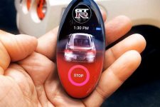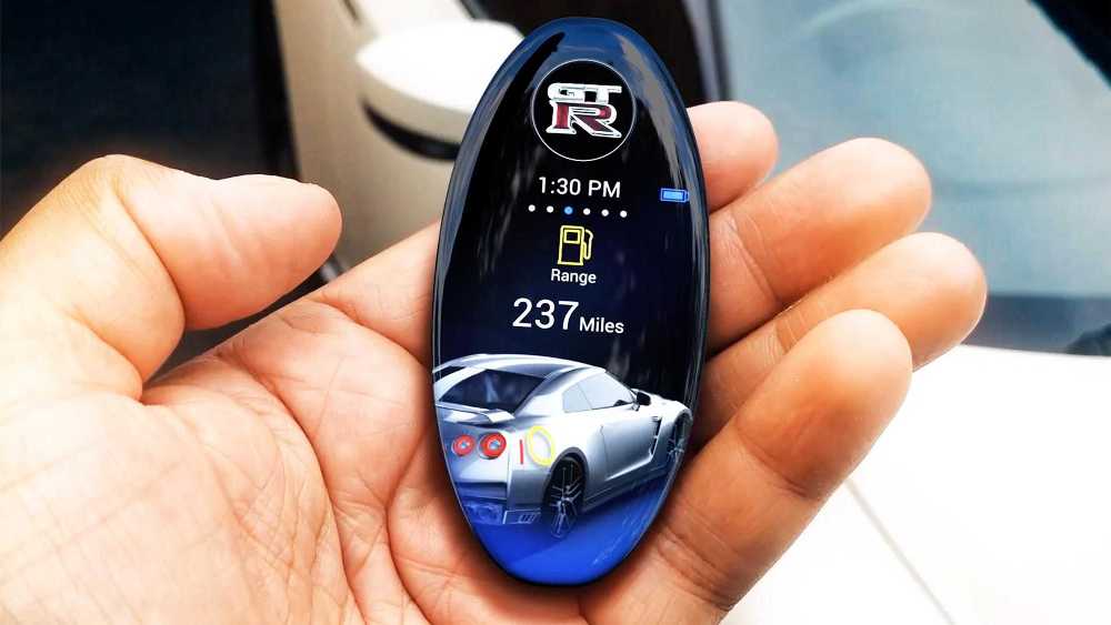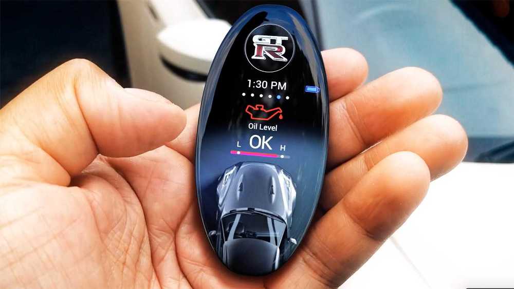Dentro del óvalo hay una pantalla táctil que permite navegar entre diferentes displays. En su configuración básica, la llave informa a los propietarios de si su Nissan GT-R (prueba) está bloqueado y si la alarma está activada. También pueden arrancar y parar el motor, al mismo tiempo que puede ajustar la temperatura de la cabina antes ni siquiera de subirse al coche.