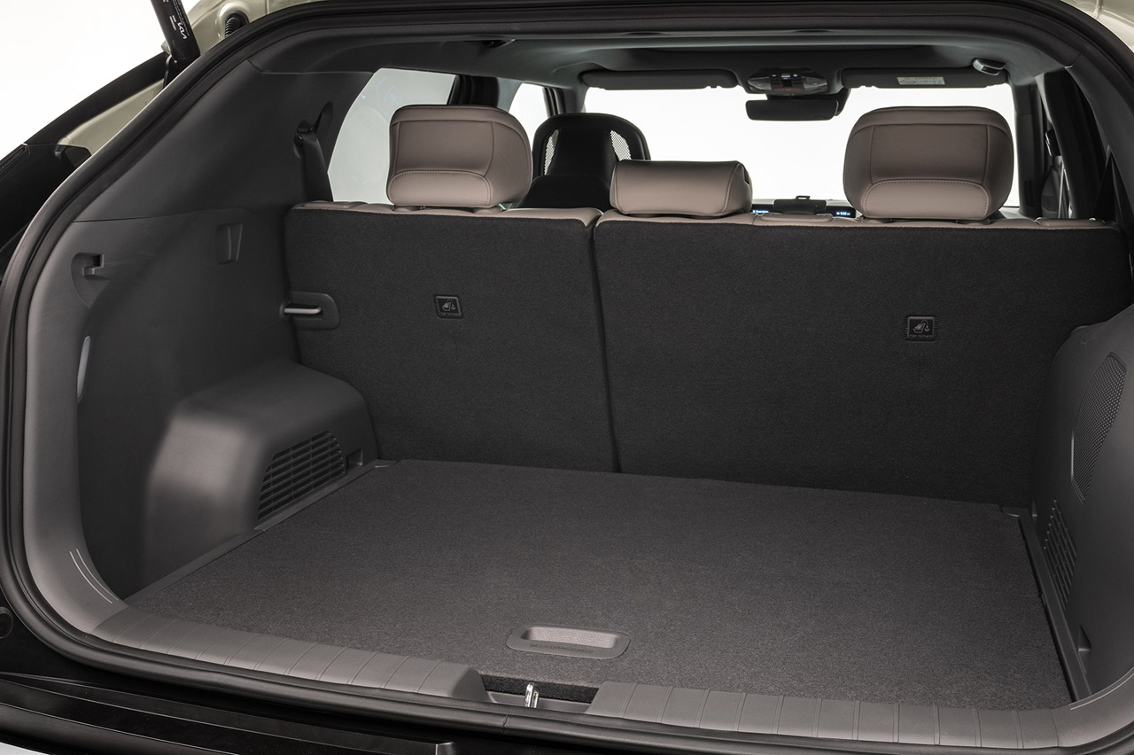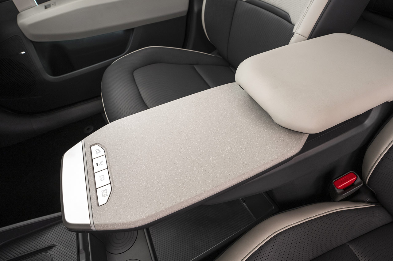 Gracias al empleo de la plataforma específica E-GMP, el piso del habitáculo es completamente plano. Esto ha permitido incorporar una consola central semiflotante que libera mucho espacio de almacenaje e integra desde tomas de carga USB-C hasta un cargador inalámbrico o dos portabebidas. El apoyabrazos central cuenta con una superficie plana extensible que hace las veces de mesita para, por ejemplo, poder dejar comida mientras esperamos a que se carguen las baterías.