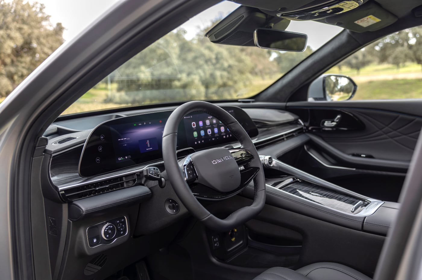 Lo mismo ocurre en el interior, al que se puede acceder con una tarjeta NFC. Presenta un puesto de mandos con materiales de buena calidad, con una muy buena apariencia tanto visual como al tacto. También tiene su protagonismo la doble pantalla curva, compuesta por dos pantallas de 12,3 pulgadas y la consola central elevada, consiguiendo que todo esté a mano del conductor. Adopta botones físicos, en concreto, ruletas giratorias, para las funciones más importantes, algo que debemos agradecer a Omoda.