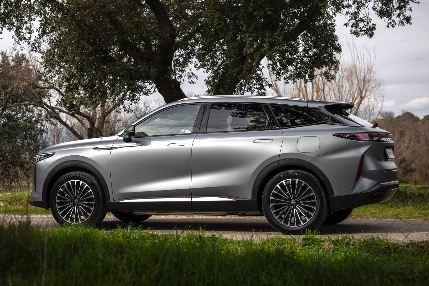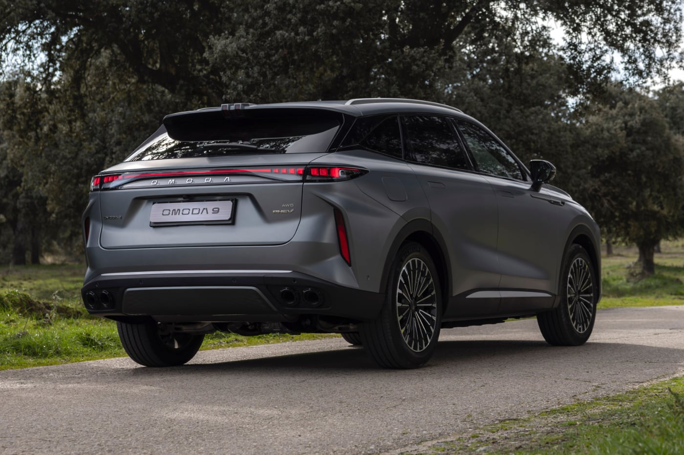 Techo con caída, frontal con una parrilla sin bordes y forma de diamante, faros afilados con luz diurna vertical en los extremos, dándole más anchura al coche; pilotos unidos, tiradores enrasados -consigue un CX de 0,308-, pilar C en negro, que logra el recurso de techo flotante y llantas de aleación de 20 pulgadas son algunos de los elementos que consiguen que el Omoda 9 sea muy sugerente. Por cierto, monta cuatro salidas de escape reales. Ojo.