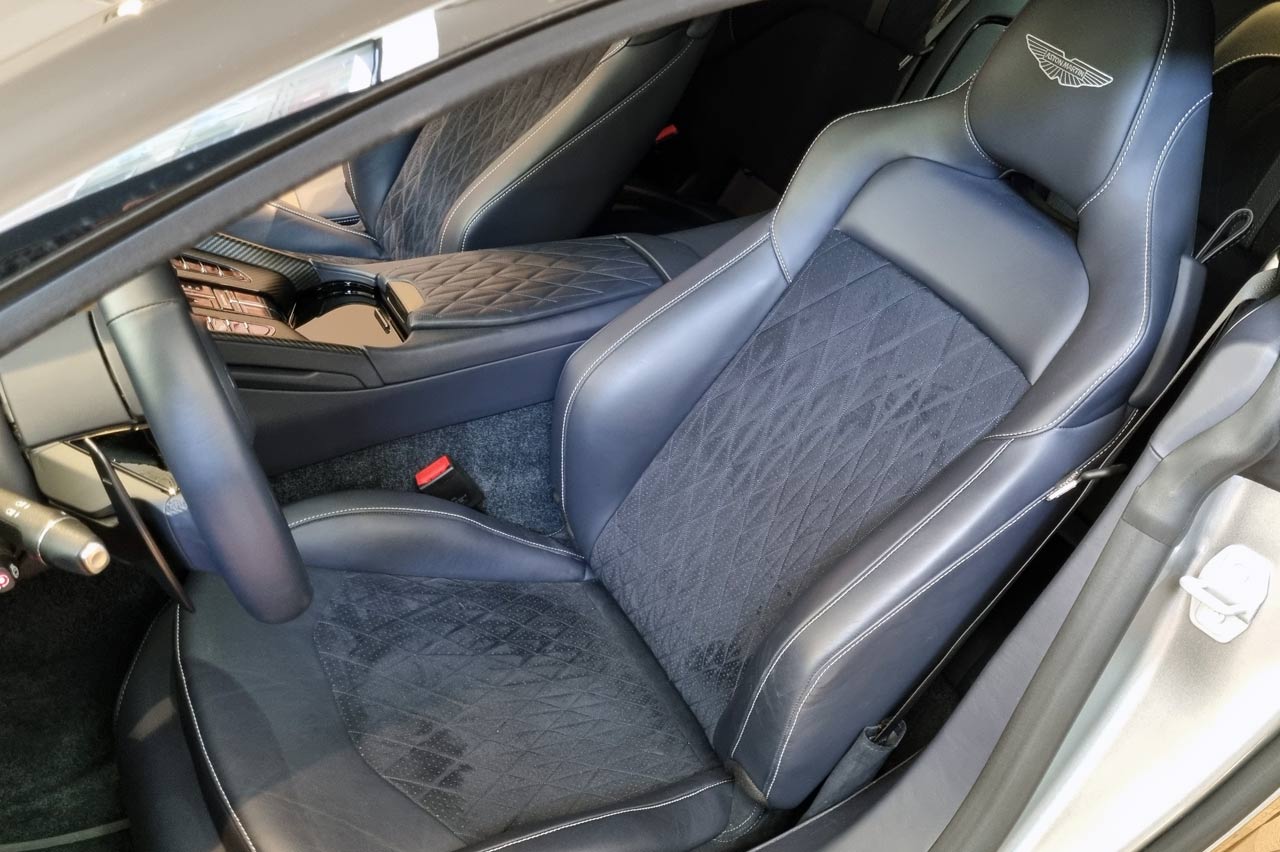 Abro la puerta, que se inclina levemente hacia arriba, y el habitáculo presenta materiales y ajustes de primera calidad. El puesto de conducción es totalmente nuevo, con un sistema multimedia con pantalla de 10,25" -desarrollado por primera vez, íntegramente, por Aston Martin-, y una buena combinación entre botones físicos, para las funciones más importantes, y táctiles, para las menos, que se hallan en una consola central inclinada. Observo el selector de cambios es una pequeña palanquita, al estilo del Porsche 911, pero parcialmente tapizada en cuero con pespuntes.