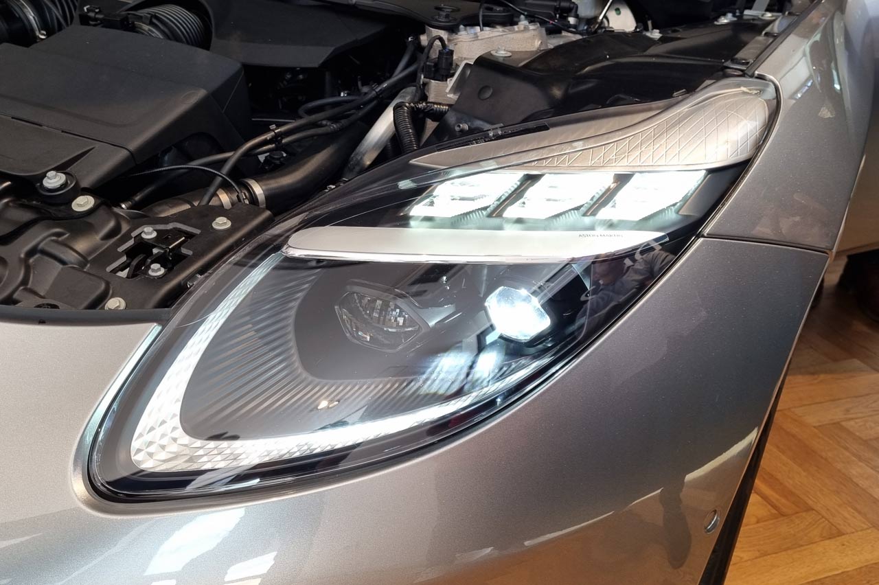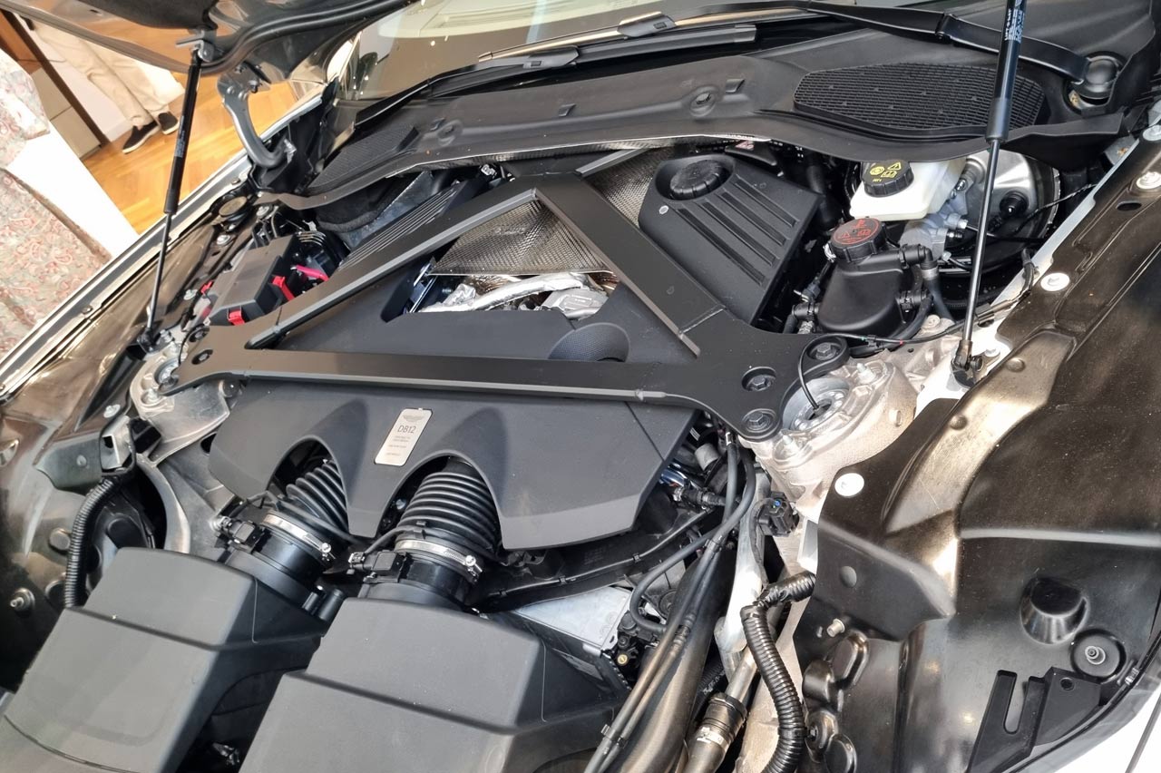 El personal de Aston Martin se encargan de abrir el capó y enseñarnos el V8 de 680 CV con doble turbocompresor. Gracias a él y a sus 800 Nm de par máximo entre 2.750 y 6.000 rpm es capaz de acelerar de 0 a 100 km/h en 3,6 segundos y alcanzar los 325 km/h de punta.