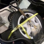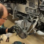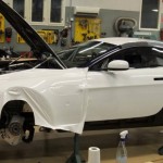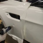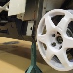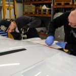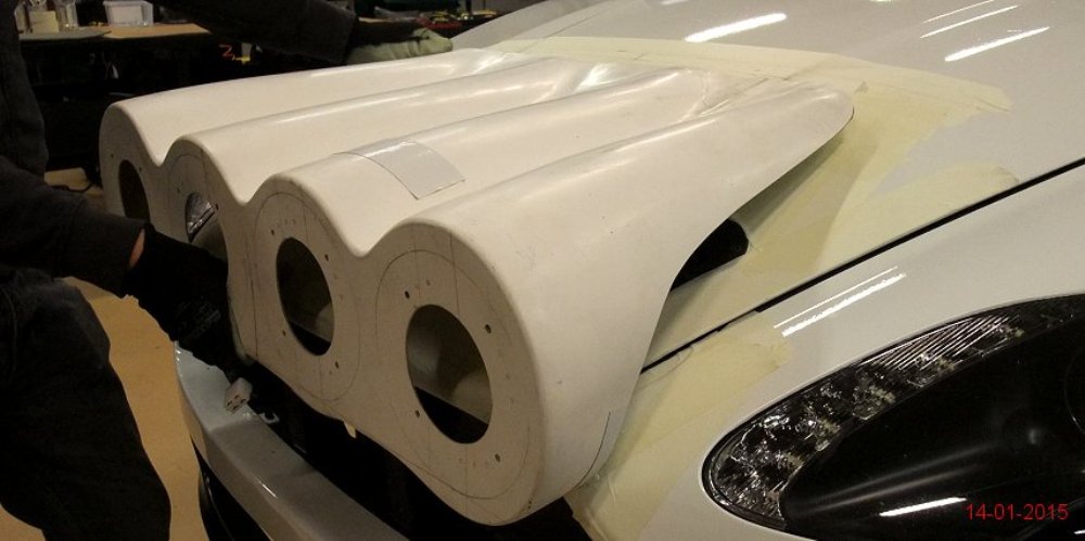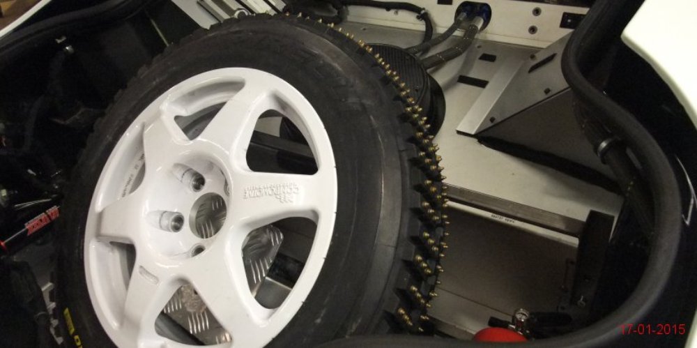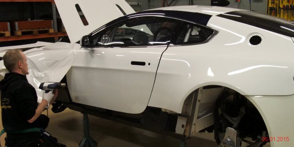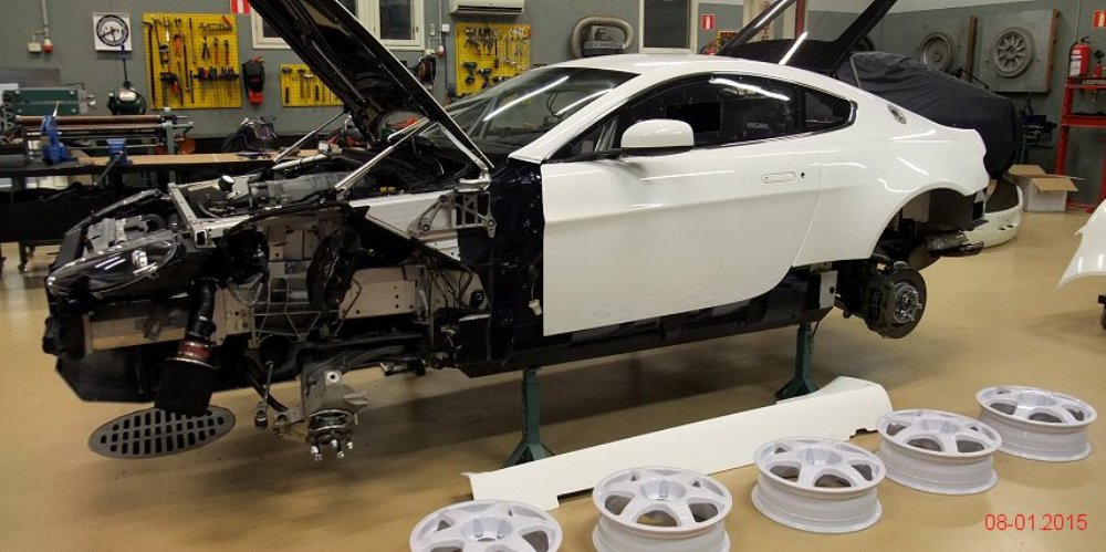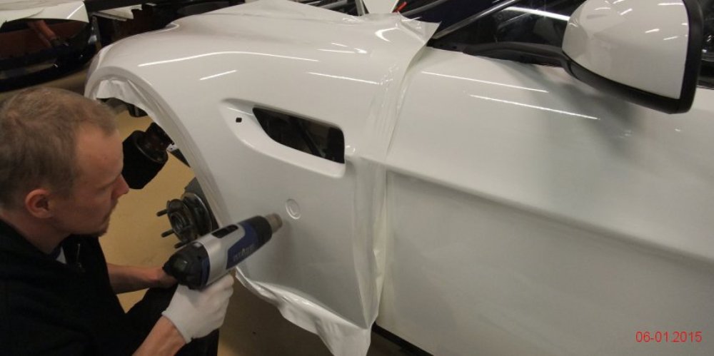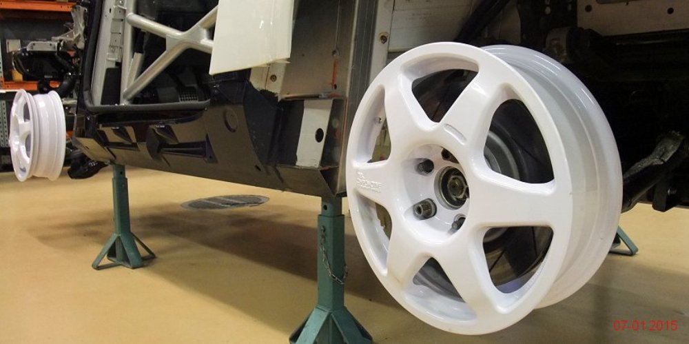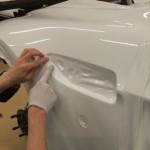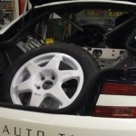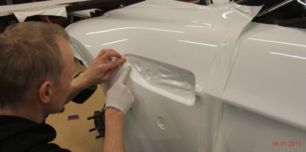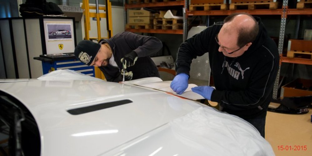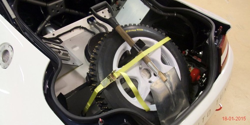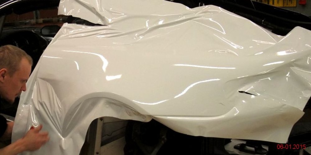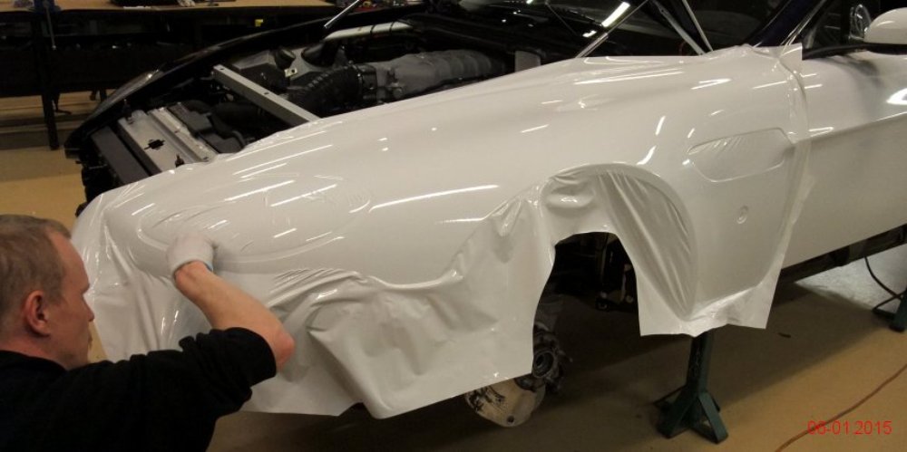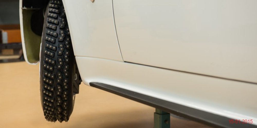 Lo primero es retirar algunos de los paneles de la carrocería para tratar de averiguar qué se esconde tras ellos. Dado que la pintura es más cara y requiere de mayor trabajo para aplicarla (desmontar, lijado, encintado, pintar con varias capas y el secado), se decantaron por instalar vinilo de color blanco por toda la carrocería, así como unas llantas Compomotive de diámetro estrecho con neumáticos de clavos para la nieve.