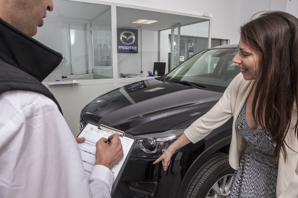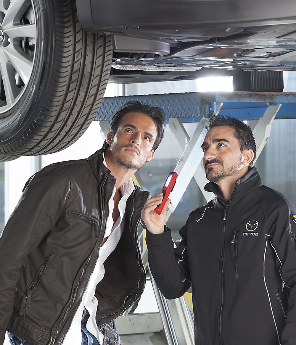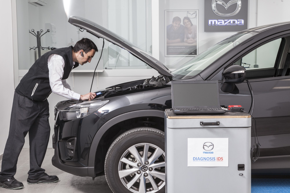El tiempo es muy valioso para todos, eso está claro. Pero es mejor dedicar cinco o diez minutos a analizar con detenimiento un coche junto a su dueño que no hacerlo. Porque si no se hace quizá luego este reciba una llamada para informarle del mal estado de los neumáticos, frenos o amortiguadores, con la consiguiente sorpresa. En Mazda reciben el coche y, tras identificarlo y prepararlo, los suben a un elevador para que un empleado lo analice junto al usuario y este pueda ver in situ los posibles defectos que presente.