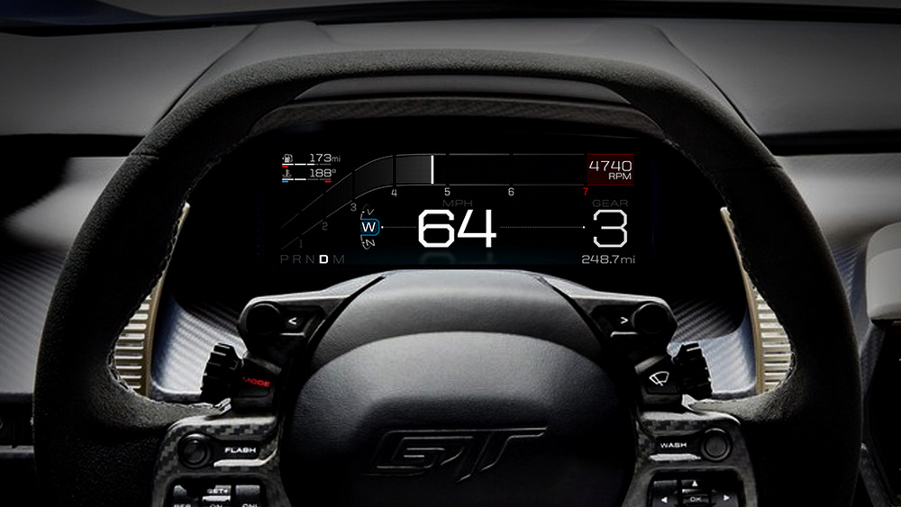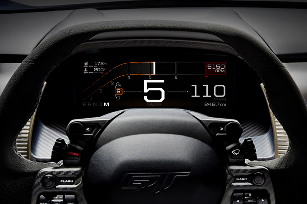 La pantalla del nuevo Ford GT es resultado de la colaboración de los diseñadores e ingenieros de Ford con los chicos de Pektron (para el diseño electrónico, desarrollo implementación y fabricación) y Conjure (para el diseño gráfico). Juntos han creado unos displays precisos y animados que incluyen fuentes tipográficas destacadas, colores y un gran nivel de respuesta. Y además, como han sido creados inspirándose en el mundo de las carreras, evitan las distracciones de los conductores al tiempo que reduce la fatiga ocular.