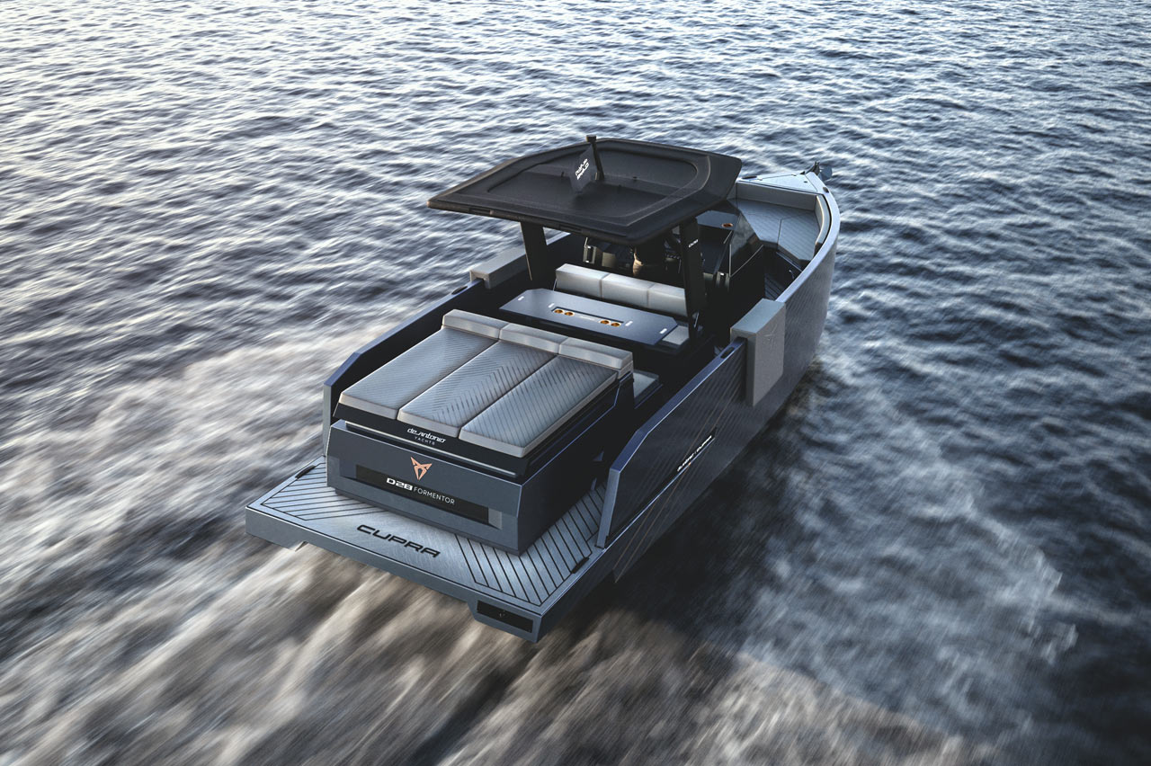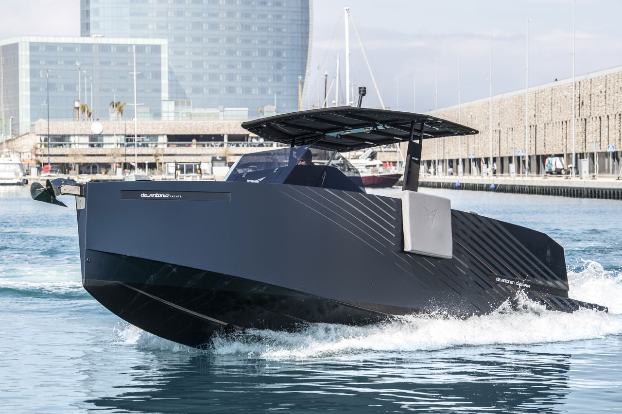 El barco de CUPRA está basado en el modelo más pequeño de la gama de De Antonio Yachts. Una lancha deportiva de tipo ‘open’ que, como el resto de embarcaciones de la firma, destaca principalmente por su innovador sistema de propulsión. Porque a pesar de lo que puede sugerir su imagen, este pequeño yate está equipado con motores fueraborda que quedan ocultos tras la plataforma de baño que tiene en la popa.