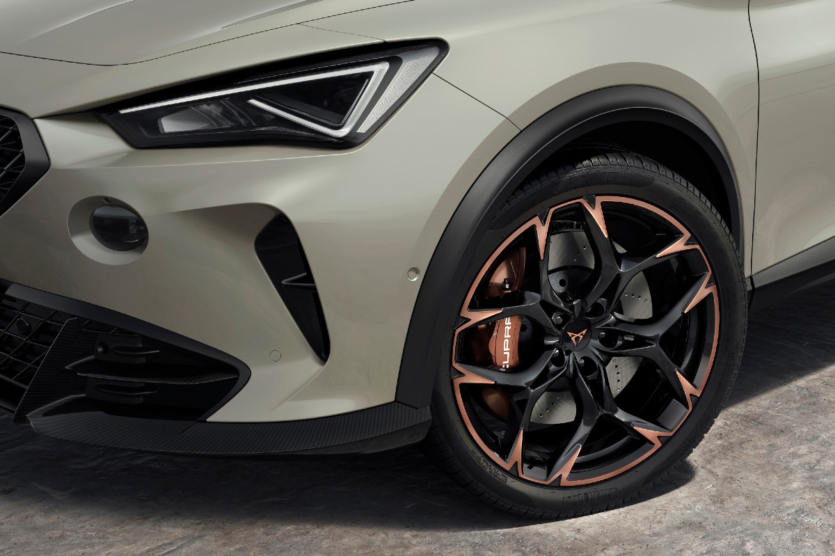 En lo que a diseño se refiere nos seguimos encontrando con la esbelta estética del Formentor, un modelo que cautiva miradas en cualquiera de sus versiones. Ahora destaca una altura rebajada de la carrocería en 10 milímetros, una tonalidad mate Gris Taiga -exclusiva de esta edición limitada, un nuevo difusor rematado en fibra de carbono, la cuádruple salida de escape diagonal pintada en cobre, el logo VZ5 y unas llantas específicas de 20 pulgadas.