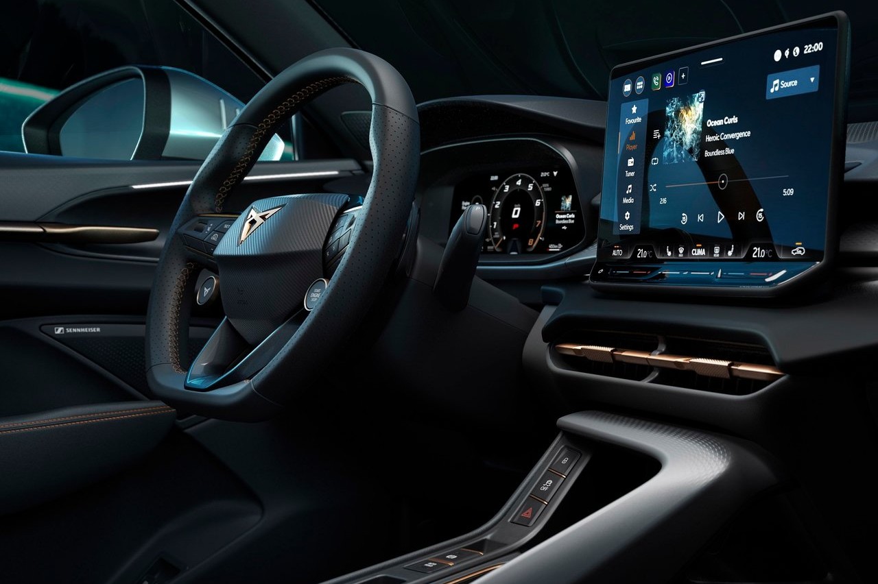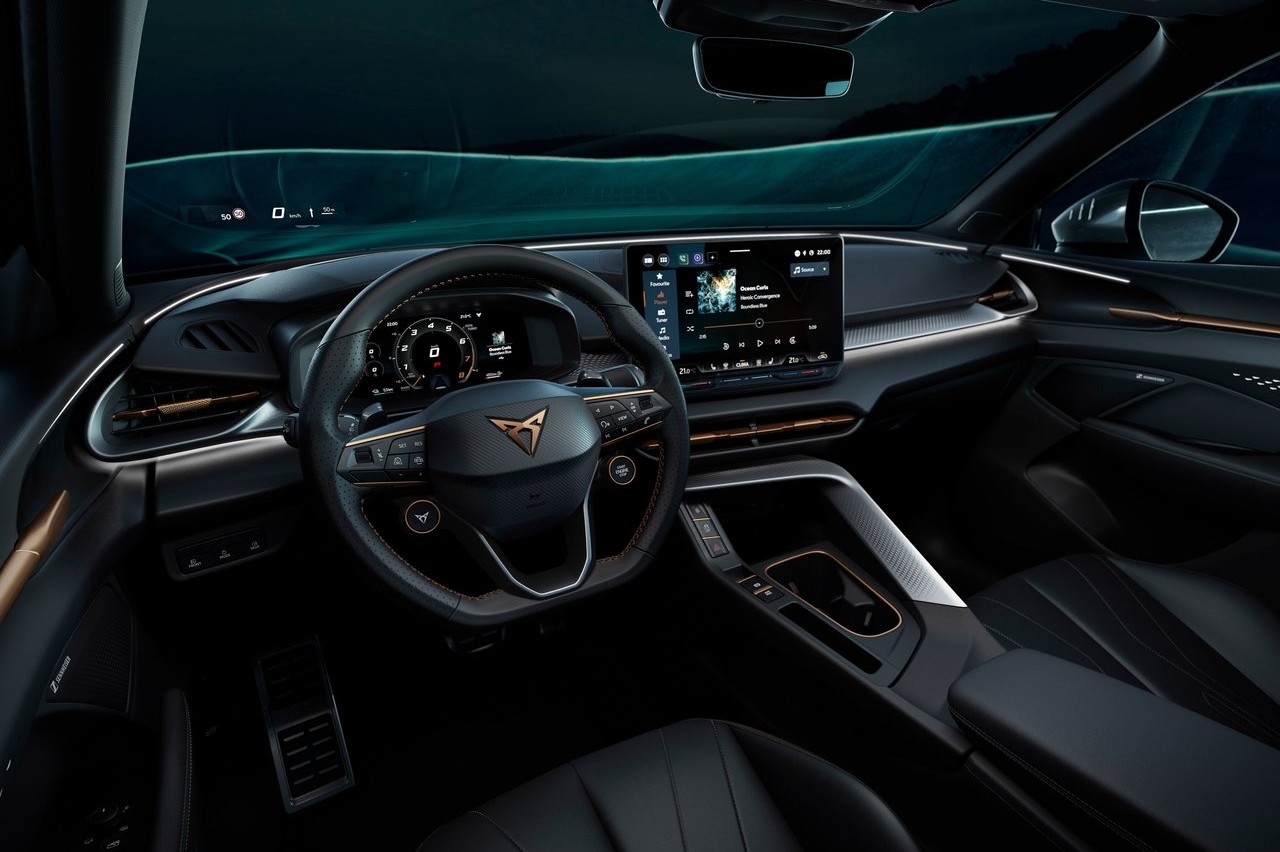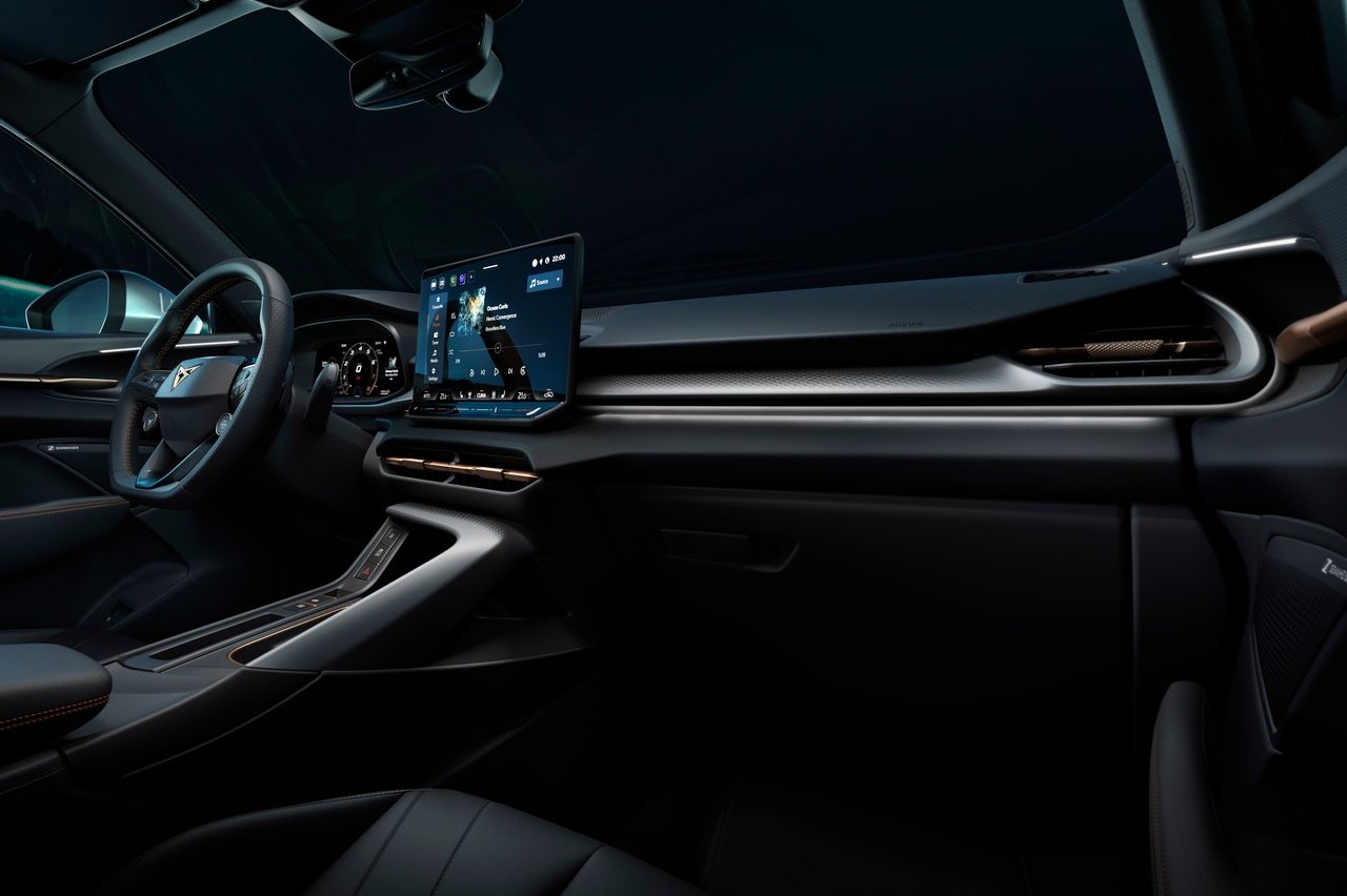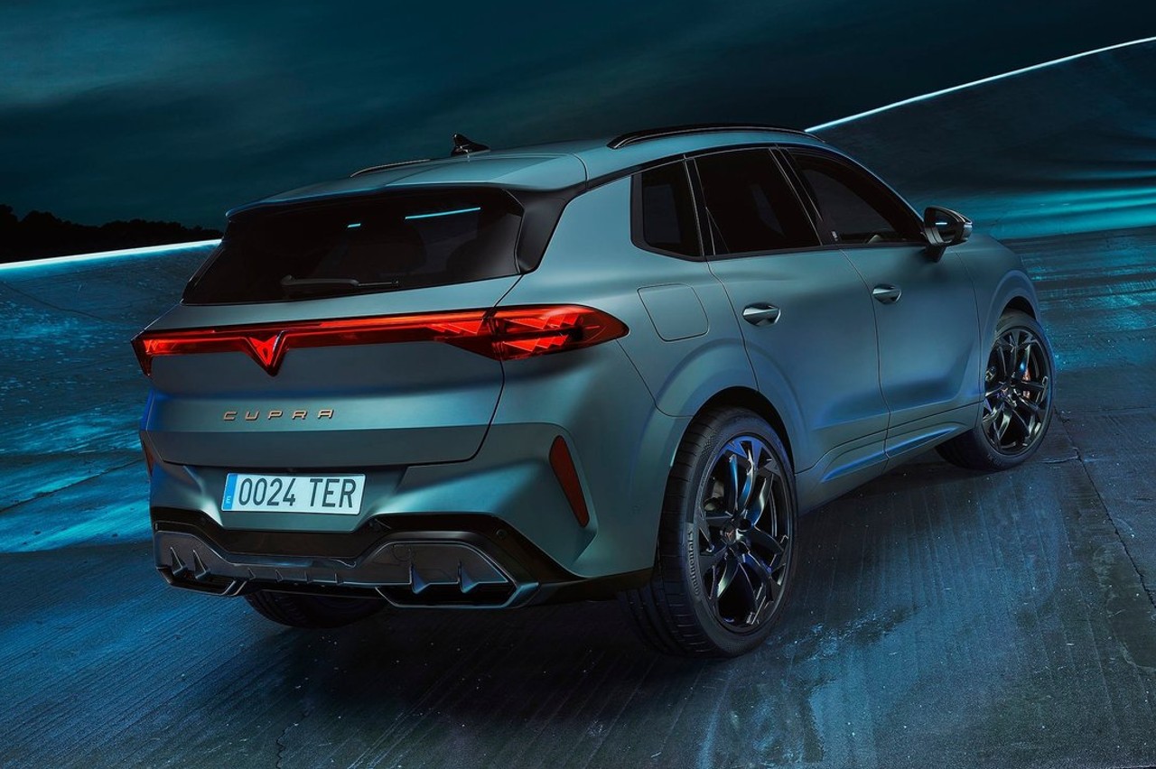 El frontal luce el nuevo lenguaje de diseño de Cupra, caracterizada por los faros con la grafía LED en forma de triángulos y que le aporta una mirada muy agresiva. El paragolpes es muy prominente, está unido al capó e integra una gran parrilla en forma trapezoidal. En la zaga, las ópticas LED con iluminación tridimensional están unidas por una infinite light con el logo de Cupra iluminado en el medio. Completan el diseño unas llantas de 18,19 y 20 pulgadas con atrevidos diseños.