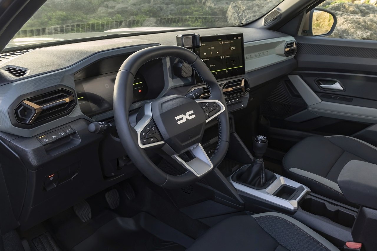 Pasando al interior del nuevo Duster 2024, el salto de calidad es notable. El salpicadero luce un aspecto mucho más moderno, presidido por una pantalla táctil de 7 pulgadas de serie y hasta 10,1 pulgadas, dependiendo del acabado. Está orientada al conductor y tiene un diseño sencillo y buena legibilidad. En las versiones más equipadas, el sistema multimedia incluye navegador conectado con mapas Here.