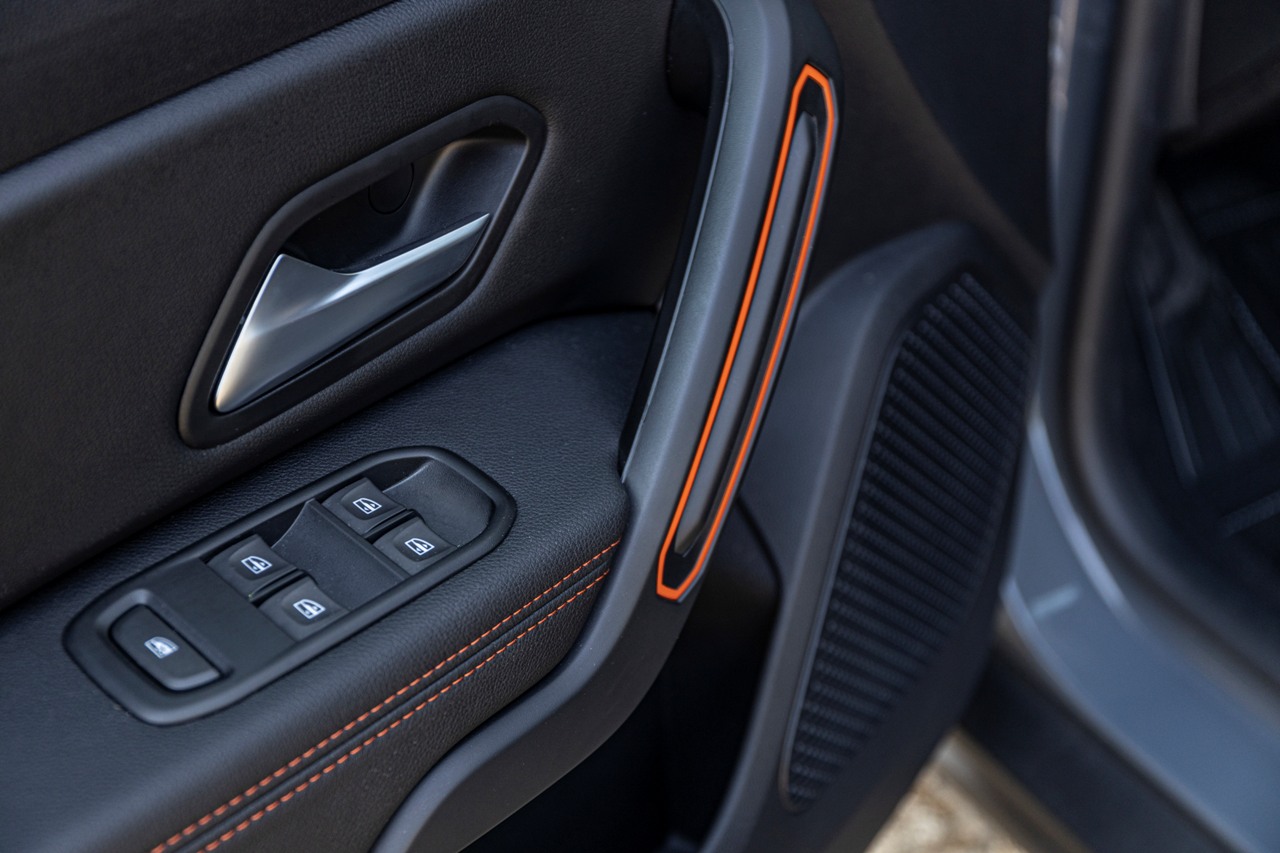 El interior también recibe una serie de destalles propios. Esto incluye una tapicería específica de tejido/TEP con pespuntes de color naranja, y detalles del mismo color en las salidas de aire, el apoyabrazos, los tiradores de las puertas y los laterales de la consola central inferior.