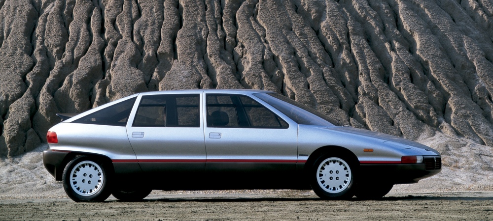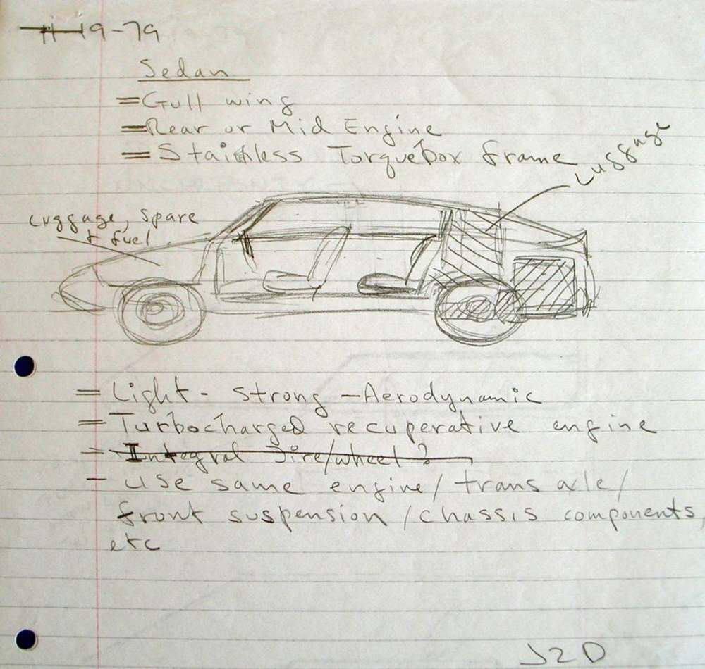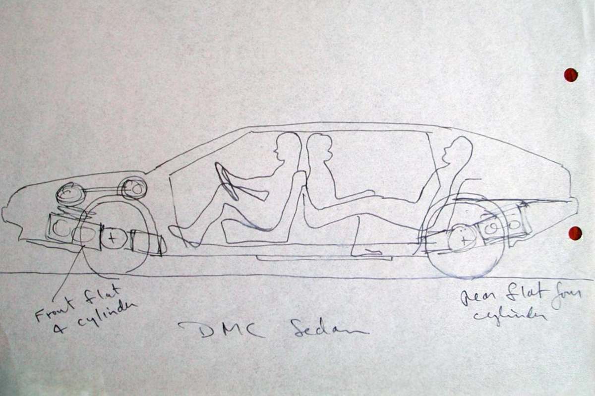 Los primeros bocetos creados a finales de la década de 1970 muestran los planes de DeLorean en su forma más original. Todo comenzaba con un sedán bimotor de tres filas de asientos moldeado sobre la icónica forma de cuña del DMC-12, conservando las características puertas de abertura vertical -alas de gaviota- que tanto representan al deportivo con carrocería de acero inoxidable.