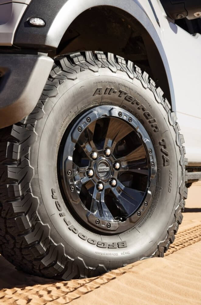 Las cifras de pesos no han sido reveladas en el Ranger Raptor de momento, pero sabemos que equipa neumáticos BF Goodrich All-Terrain en medida 285/70 R17, los cuales, además, tienen una anchura de 284 mm y un diámetro de 838 mm. Por el contrario, el F-150 Raptor aumenta, como viene siendo habitual, las medidas de sus neumáticos para formar parte de su descomunal presencia y facilitarle obtener los mejores resultados ante cualquier obstáculo.