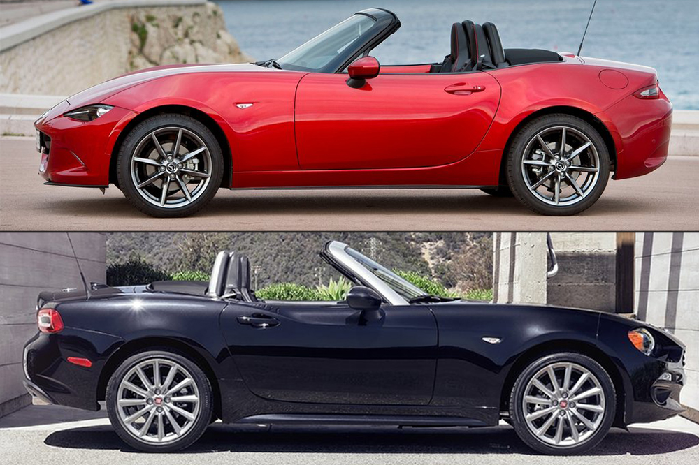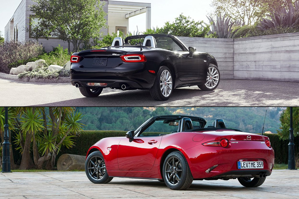 El peso es de 1.105 kilogramos en el Fiat equipado con transmisión manual, mientras que el Mazda es más ligero, con 1.057 kilogramos. Las diferencias en las dimensiones se hacen más visibles desde el lateral. Mientras que en el MX-5 las ruedas son empujadas a las esquinas, los salientes en el Fiat son mayores en comparación. Según el fabricante italiano, esta medida se ha llevado a cabo para aumentar la capacidad de carga y hacer que el pequeño roadster sea más práctico. Con todo, el Mazda presenta 130 litros frente a los 140 litros del Fiat.