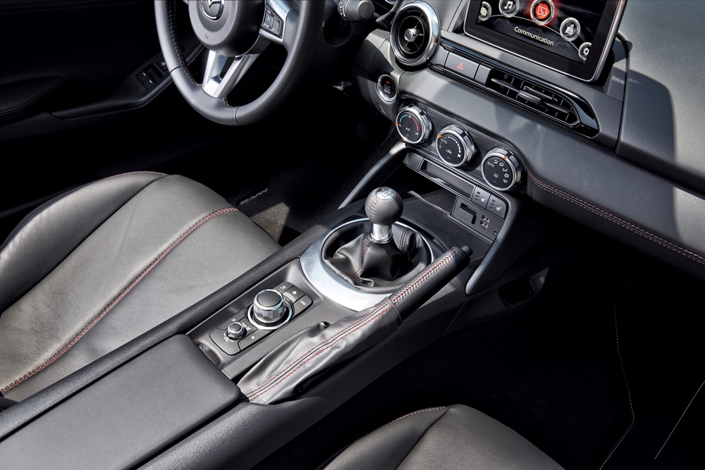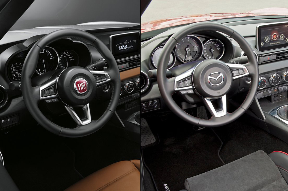 Fiat, por su parte, asegura que llevó a cabo una serie de cambios en el interior, aunque no son fáciles de detectar. Los paneles interiores de las puertas son ajustados, no hay una capa adicional de material en el salpicadero, y el panel de instrumentos utiliza diferentes tipografías y colores que concuerda con el resto de productos de la firma de Turín. El sistema de infoentretenimiento es de Mazda, mientras que el volante del 124 Spider es más grueso.