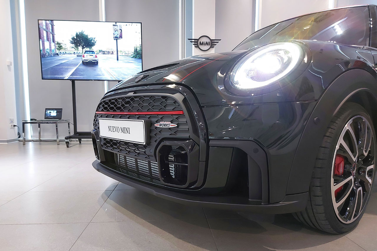 Y para ello empezamos hablando del exterior y más concretamente, del frontal. Como puedes apreciar en la fotografía superior, luce un nuevo paragolpes e integra una parrilla rediseñada. Esta última tiene unas dimensiones más grandes, pues ahora se extiende hasta la llegar al faldón inferior en todas las variantes. El MINI 2021 que puedes ver en las imágenes cuenta con acabado John Cooper Works, el más deportivo de la gama, en el que nos encontramos con una parrilla de aspecto más agresivo que se extiende por delante del tradicional paragolpes.