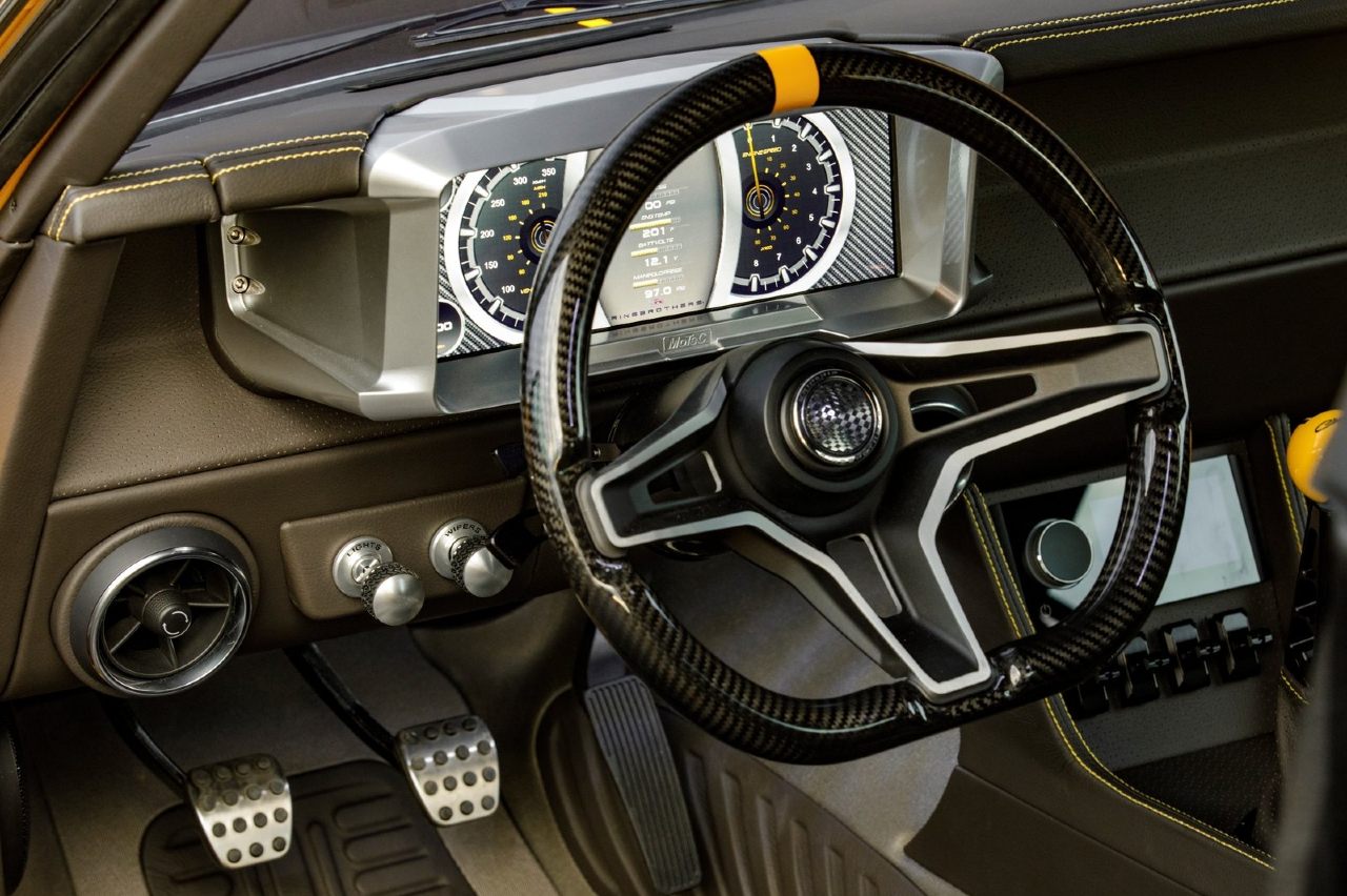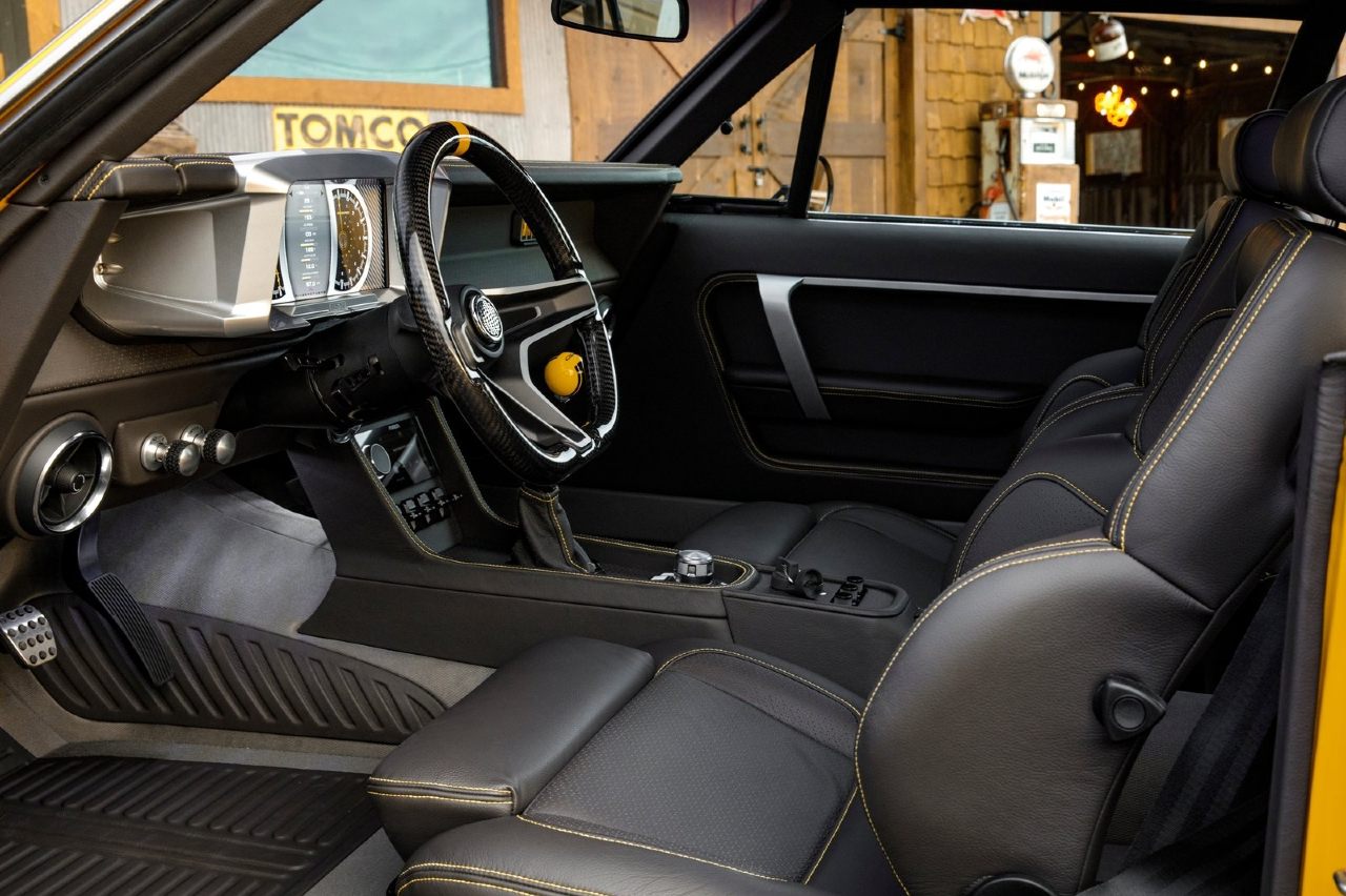 El habitáculo también tiene un trabajo considerable, siendo el resultado final relativamente discreto, con la piel negra como protagonista y dejando el amarillo como tono de contraste para las costuras. Lo más relevante es el volante de fibra de carbono hecho a medida y que cuenta con detalles como el botón de la bocina impreso en 3D.
