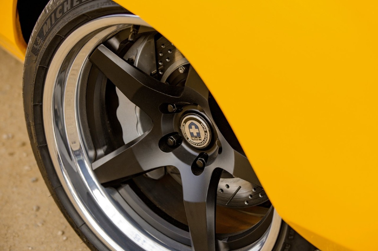 Lo primero fue poner a tono la carrocería, que más adelante se pintaría en un llamativo color amarillo, con una franja negra en la zaga, una zona del mismo tono en el capó y con numerosos elementos cromados en frontal y zaga. A nivel visual también caben destacar las llantas HRE con diseño de cinco radios.