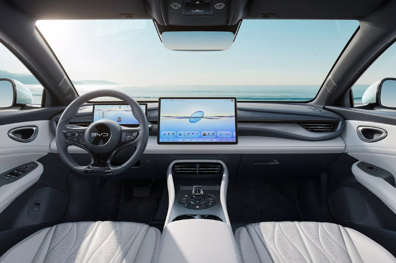 El interior recuerda ligeramente al BYD Seal berlina, sobre todo, el volante y la mayoría de los botones, aunque el salpicadero y las tomas de ventilación son específicas.