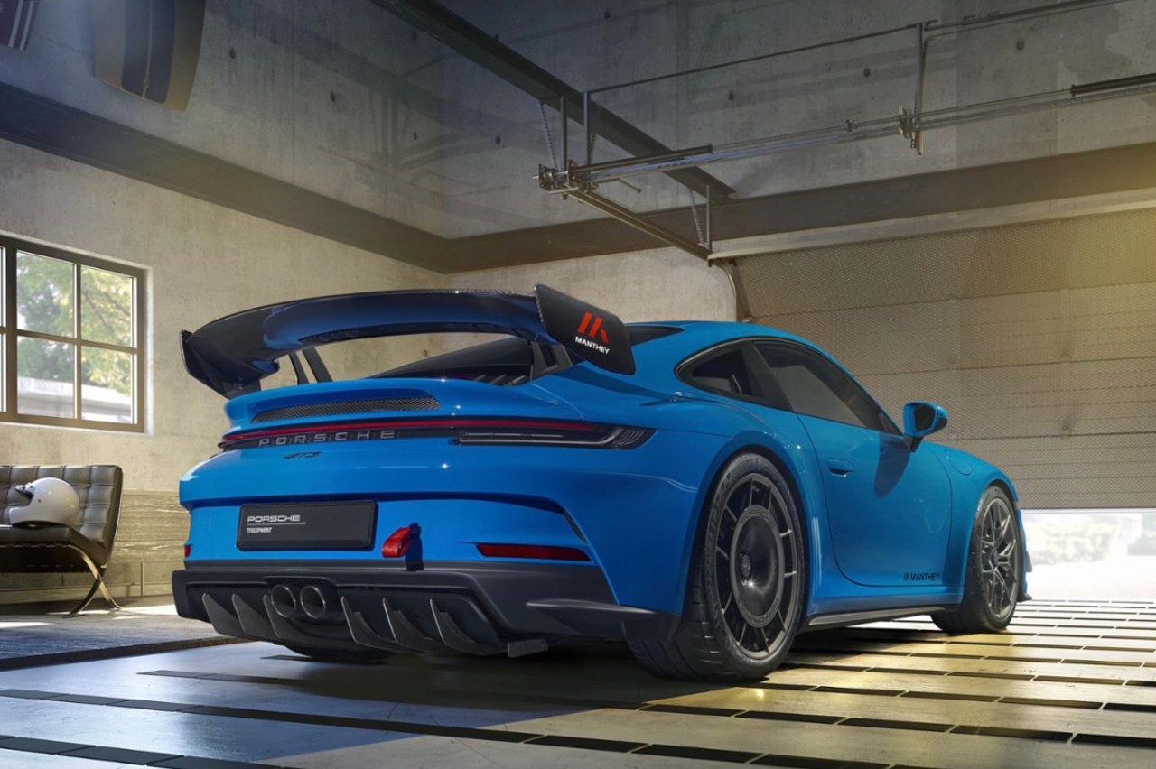 Las placas de los extremos con sus distintivos logotipos de Manthey son más grandes y también ha variado el ángulo de ataque del alerón. Las aletas del difusor trasero se han ampliado y ahora están hechas de polímero reforzado con fibra de carbono (CFRP). Los discos aerodinámicos incorporados a las llantas traseras, que también están hechos de CFRP, mejoran aún más la eficiencia aerodinámica del automóvil.