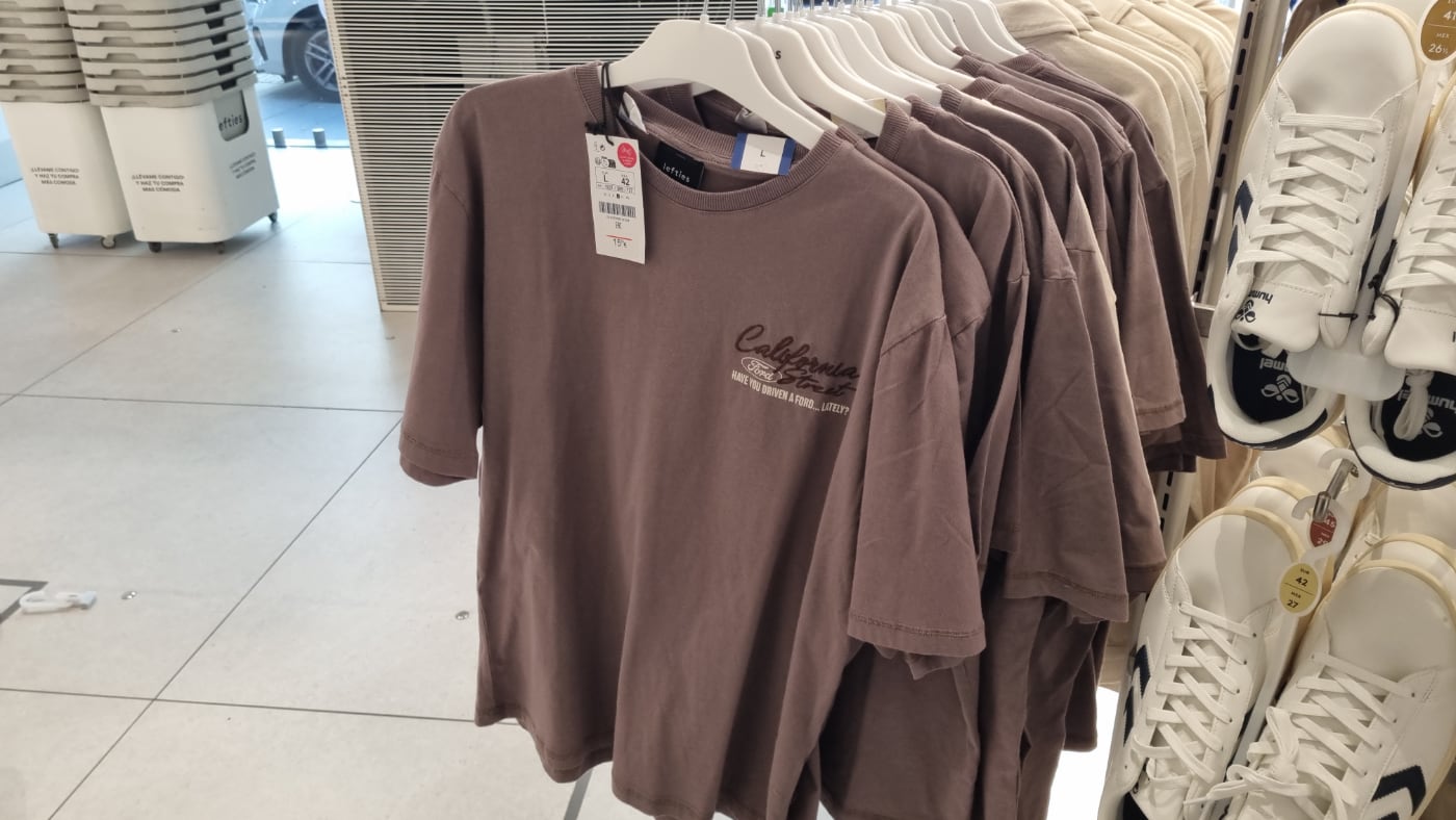 También en Lefties, aunque aquí, hablando de marcas, hay menos variedad. Ford es la protagonista con el Mustang de tercera generación -aquí tienes la historia del Ford Mustang- en la parte trasera de una de sus camisetas de manga corta y cuello redondo acabado en canalé y en un tejido de efecto lavado 100% algodón.