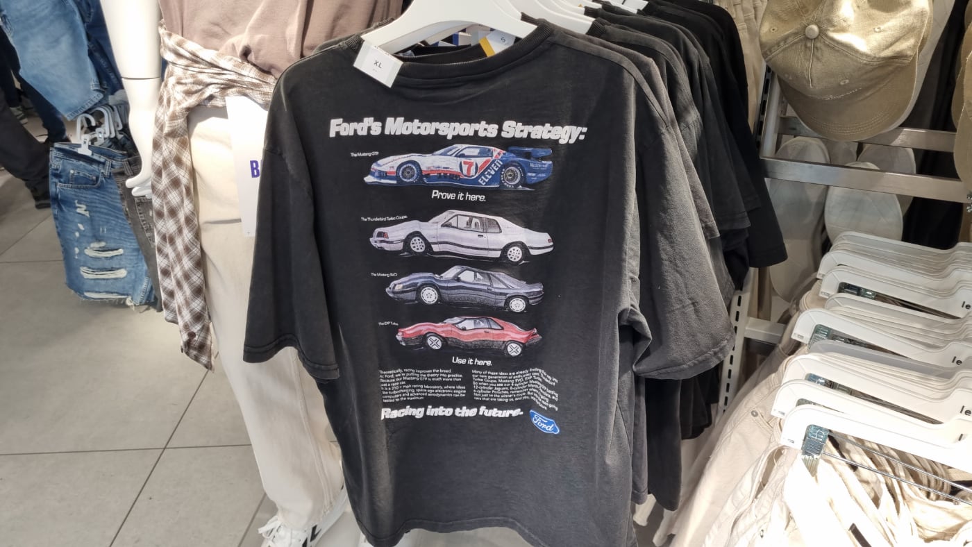 En otra camiseta, esta oscura, rinde homenaje al Motorsport. En la parte delantera está el logotipo de la marca de Detroit junto con las palabras Racing into the future. Detrás, la frase Ford's Motorsports Strategy, con el Ford Mustang GTP, más el Thunderbird Turbo Coupé, el Mustang SVO y el EXP Turbo.