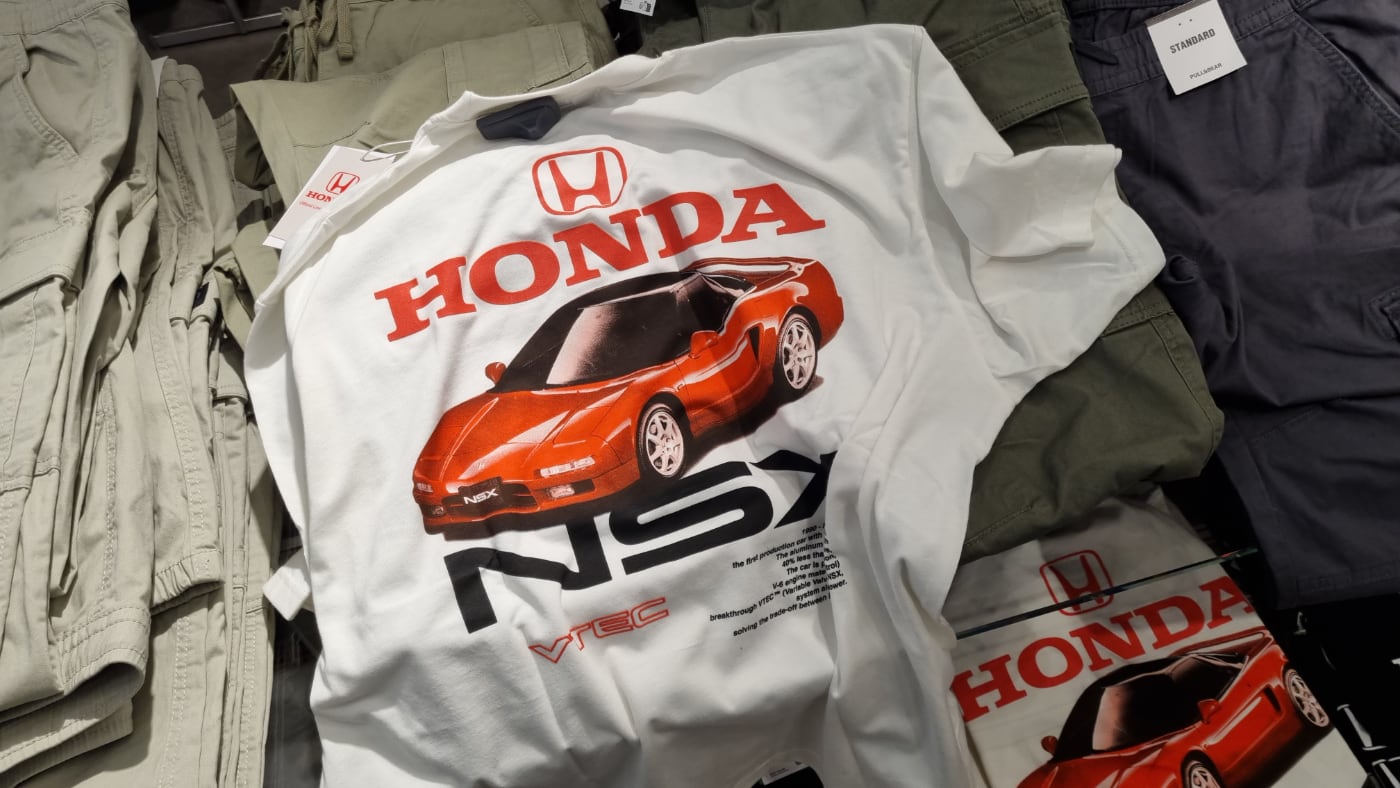 Por ejemplo, en Pull & Bear podrás encontrar una camiseta de manga corta con cuello redondo en el que la parte delantera está impreso el logotipo de Honda y en la trasera, el Honda NSX de primera generación. Lástima que no hayan lanzado una con Ayrton Senna con sus míticos mocasines con calcetines blancos exprimiendo el deportivo japonés. Por cierto, te dejo el especial con los coches de calle de Ayrton Senna.