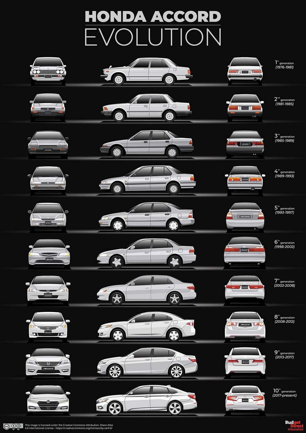 Durante la crisis energética de los años '70, Honda se decidió a lanzar la berlina Accord. Al principio tenía un tamaño similar al del Volkswagen Golf, pero a finales de los '90 ya fue catalogado como una berlina media. Ya van diez generaciones de este sedán, que dejó de venderse en Europa hace unos cuantos años.
