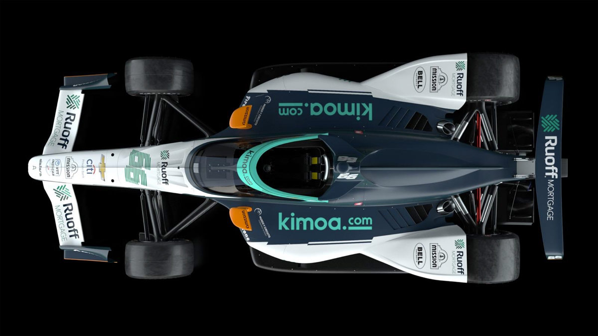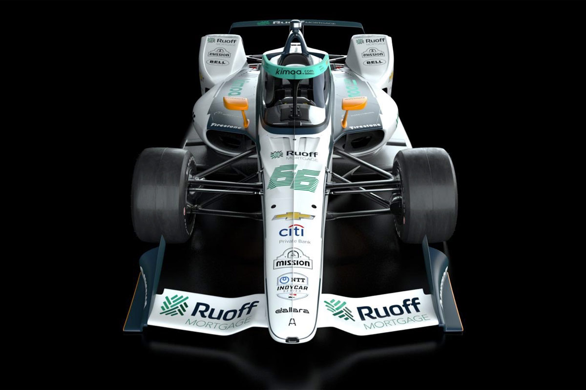 coche de Fernando Alonso para la Indy 500 con las decoraciones de Rouff Morgage, Kimoa y City