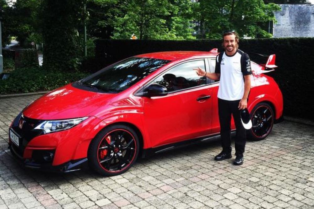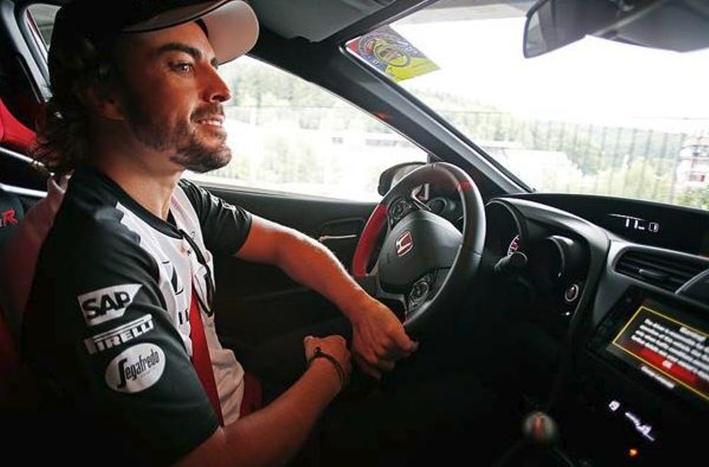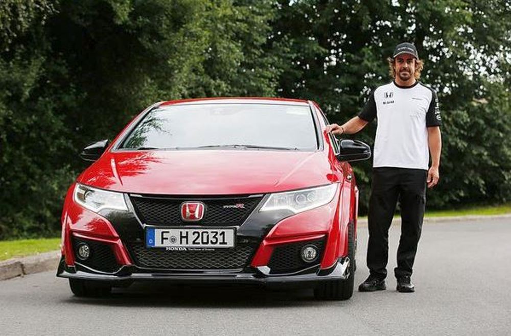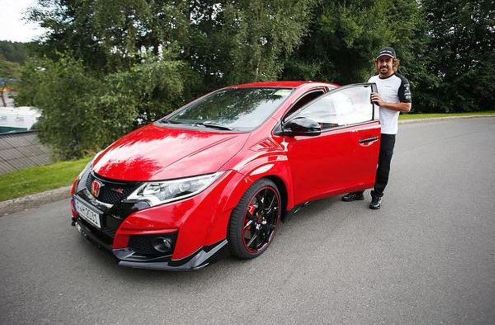 Un sonriente Fernando Alonso aparece en distintas fotos publicadas en los perfiles en redes sociales del piloto español y de la escudería Honda de Fórmula 1, acompañado de un despampanante Civic Type R 2015 en color rojo intenso. El que ya es el nuevo coche del asturiano llega justo antes de que dé comienzo el GP de Bélgica 2015.