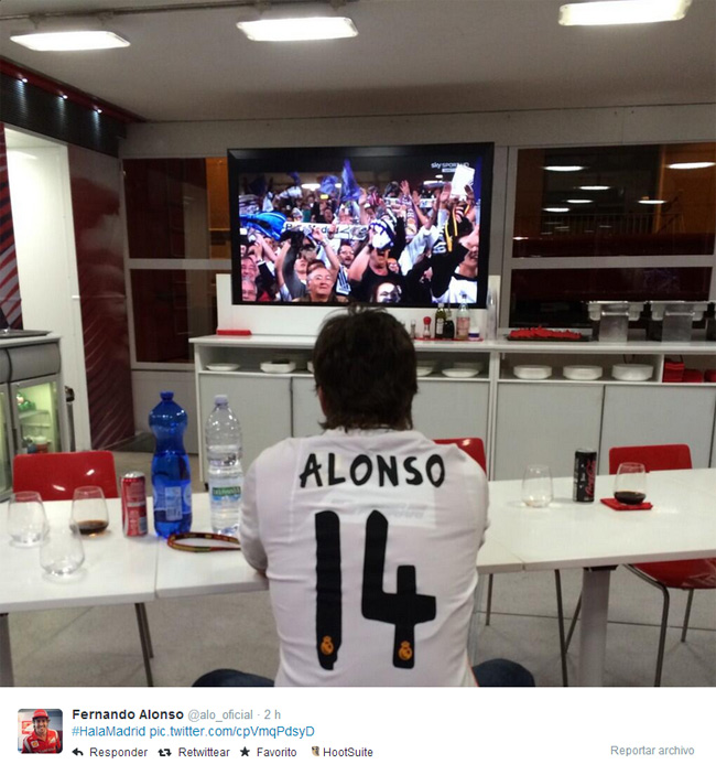 Fernando Alonso, merengue confeso, ha visto el partido de la final de la Champions entre el Real Madrid y el Atlético de Madrid en Mónaco. El asturiano ha subido una foto a su perfil de Twitter con la camiseta del equipo blanco con el hashtag #HalaMadrid.