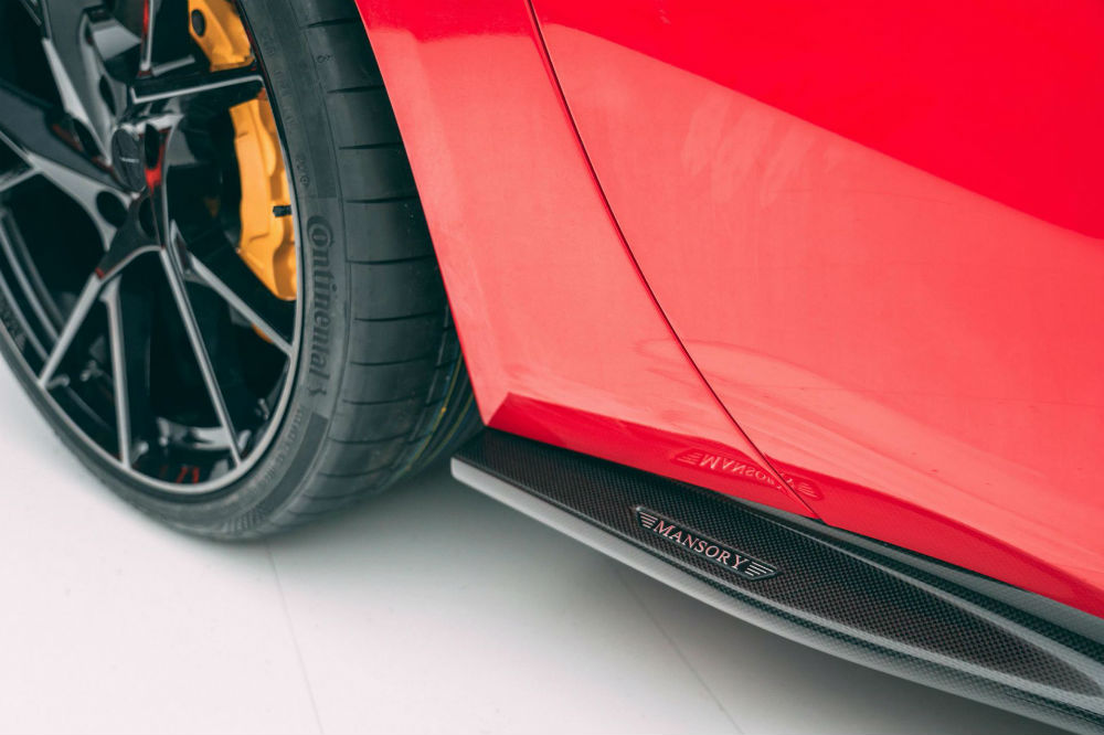 La lista de componentes es bastante larga: pieza central de la parrilla delantera, añadidos inferiores en el paragolpes, labio delantero, faldones laterales, logos tras los pasos de rueda delanteros, el discreto alerón trasero y el para nada discreto difusor, que aloja las dos salidas de escape dobles. Todos ellos están hechos de fibra de carbono y pueden elegirse tanto en el acabado brillante que se ve en las fotografías o en mate.