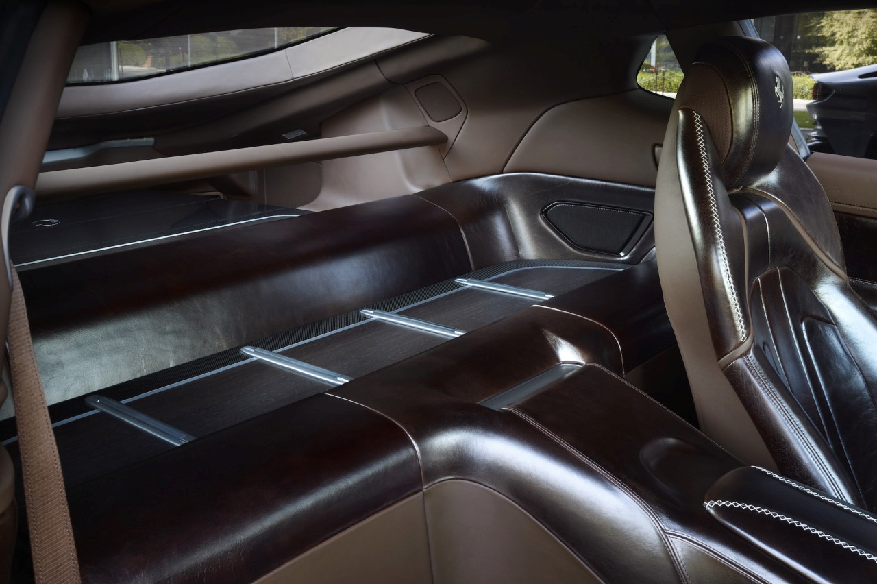 El interior del Ferrari BR20 es tan especial como el resto del vehículo. Combina dos tonos de marrón con abundantes detalles en fibra de carbono. Los asientos están tapizados en cuero de color marrón Heritage Testa di Moro, adornados con costuras en cruz plateadas. Se han eliminado los asientos traseros originales del GTC4Lusso y se ha instalado una elegante plataforma para el equipaje elaborada en roble.