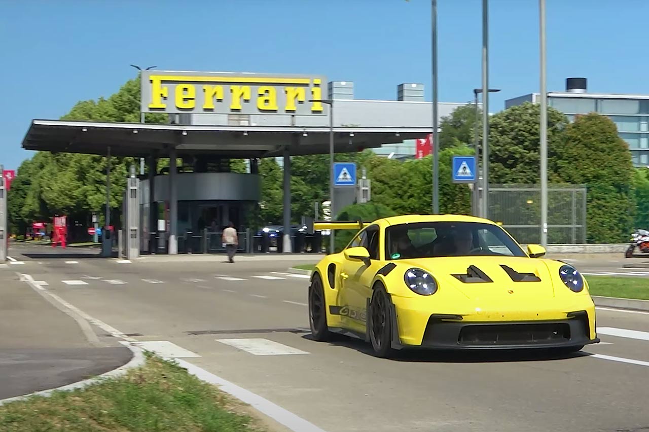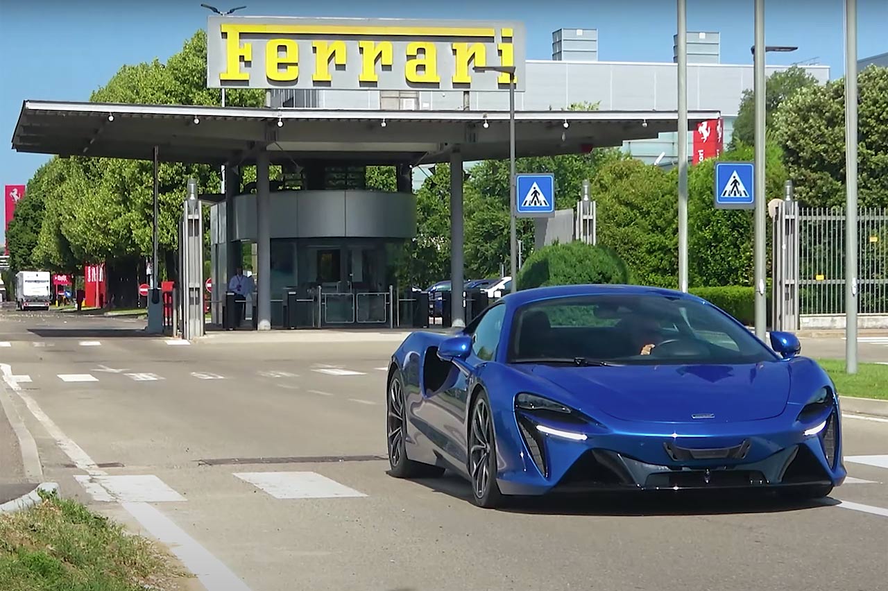 Sin embargo, lo interesante está en los coches de otras marcas que salen del interior de la fábrica. Se puede ver tanto a un Porsche 911 GT3 RS como a un McLaren Artura, dos vehículos que son rivales directos de algunos de los modelos que tiene en su gama. Parece lógico, pues, que el fabricante italiano los ponga a prueba para analizarlos y poder desarrollar mejoras para sus propios automóviles.