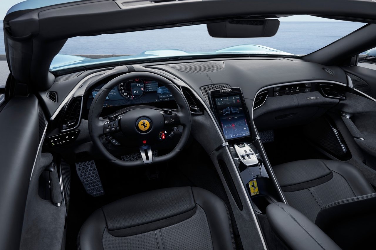 El interior sí ha recibido cambios para adaptarse a la capota, que completa la operación de plegado y desplegado en solo 13,5 segundos y a una velocidad de hasta 60 km/h. Ferrari ha añadido un sofisticado sistema móvil de deflector de viento integrado en el respaldo trasero y patentado por Maranello para garantizar el confort de los dos ocupantes.