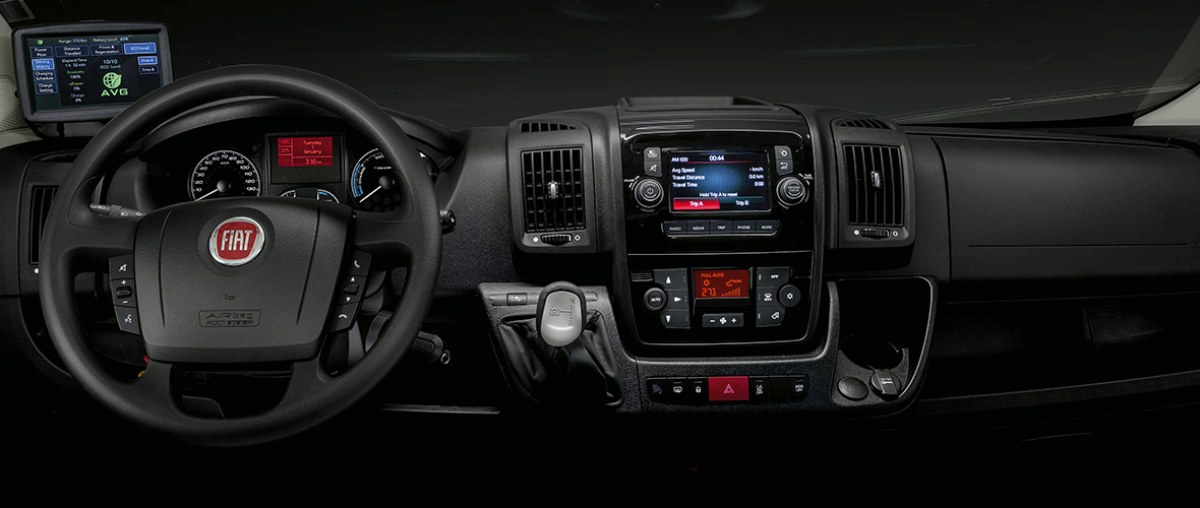 Dentro, los clientes del Fiat Ducato eléctrico encontrarán un cuadro de instrumentos que ha sido reconfigurado, con un cuentarrevoluciones que ha sido eliminado para dar paso a un medidor de potencia, mientras que el indicador del depósito de combustible ahora muestra el nivel de carga. La palanca que gestiona la transmisión es nueva, al igual que la pantalla superior izquierda, que actúa como una unidad de control que permite gestionar diferentes parámetros del sistema de propulsión eléctrico.