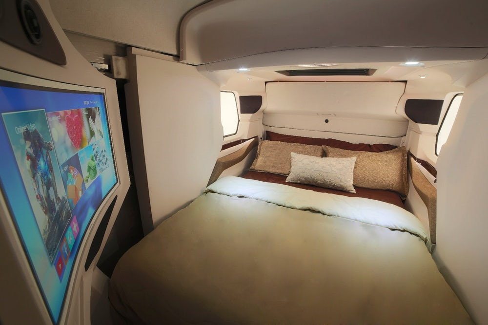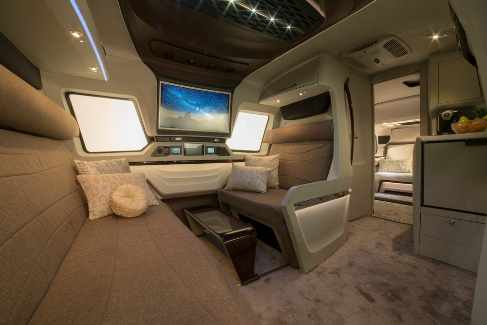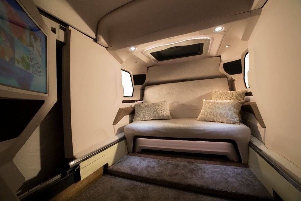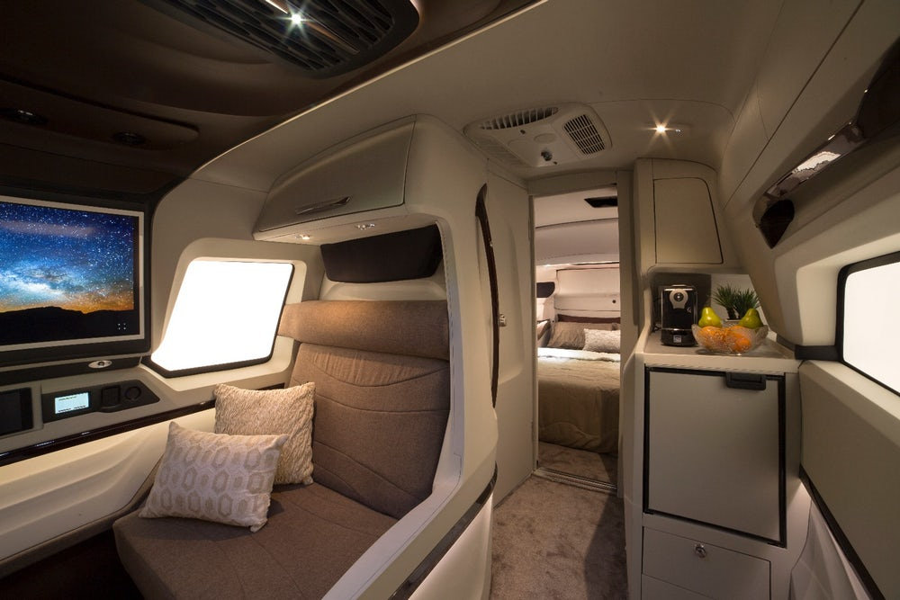 Porque pasamos de un exterior tosco y poco agraciado a un interior de líneas elegantes sin dejar de ser práctico. Y no lo decimos únicamente porque haya espacio para un pequeño salón convertible en cama, una cocina o un baño completo, es que la parte trasera se desliza y expande hacia fuera para aumentar el espacio disponible en el dormitorio principal. Este último está separado del resto del habitáculo por una puerta, por lo que los usuarios disfrutan de más privacidad.