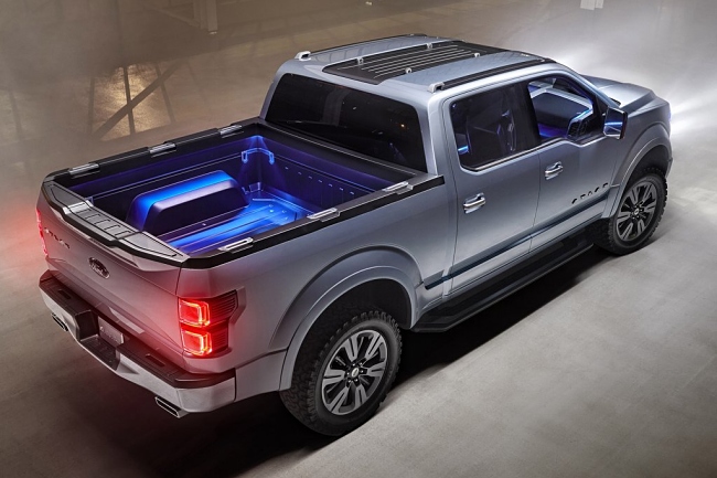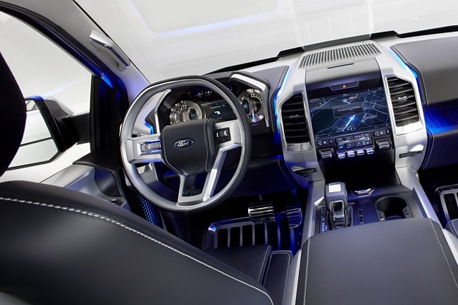 El nuevo Ford Atlas Concept destaca por ofrecer una imagen todavía más agresiva, con un frontal de colosales dimensiones y abundantes cromados que le proporcionan esa estética de ‘chico malo’ que tanto gusta a los consumidores. Los neumáticos todoterreno se suman a todo esto para brindar un aspecto aún más poderoso debido, entre otras cosas, a las llantas de aleación pintadas en color titanio. Los faros traseros parecen haber sido tomados por la versión más radical –en términos offroad- del modelo actual, el F-150 SVT Raptor.
